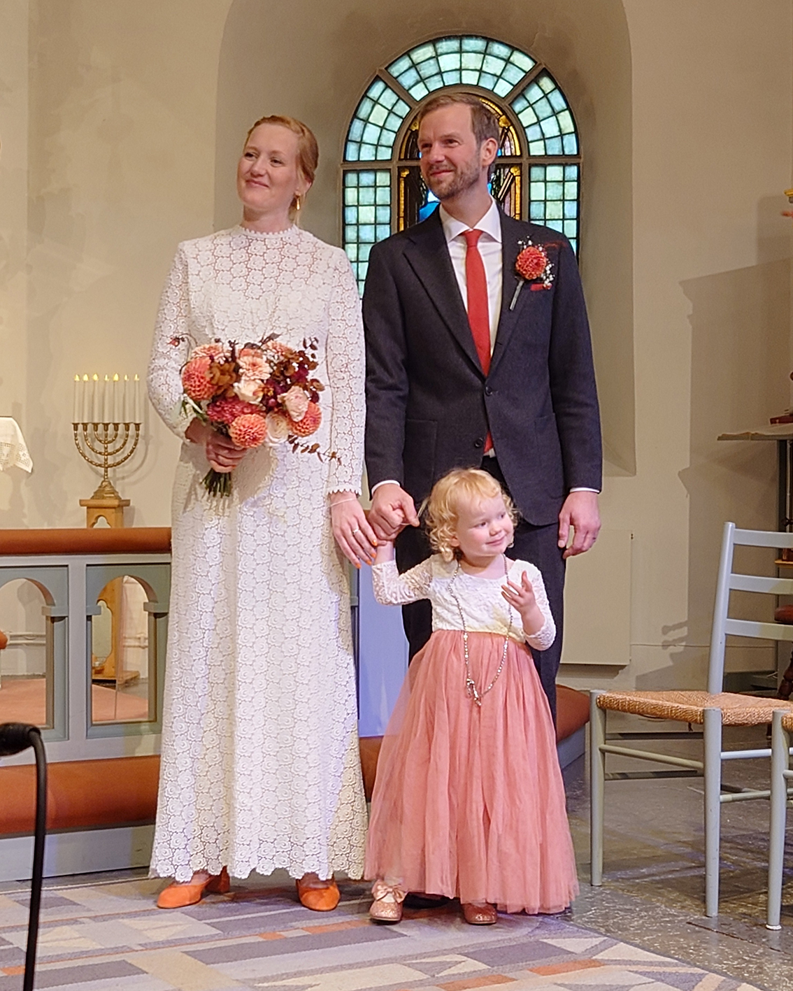 Brudparet tågade in till John Williams "Jurassic Park"-låt. Parets treåriga dotter medverkade också med att hålla brudbuketten.