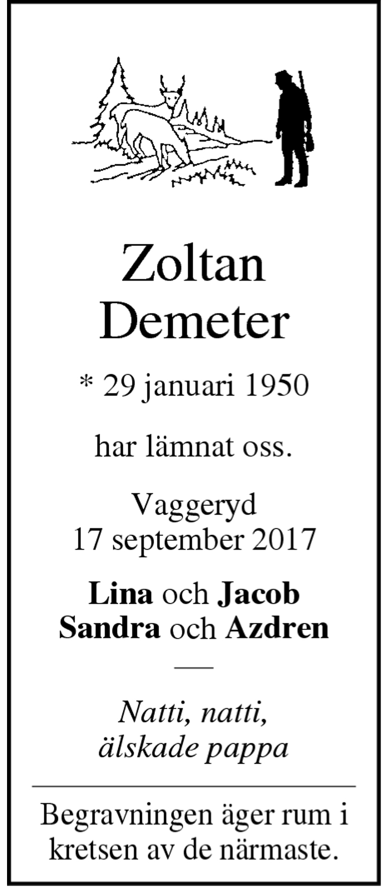 Zoltan Demeter från Vaggeryd avled den 17/9 2017. Han var född den 29/1 1950.
