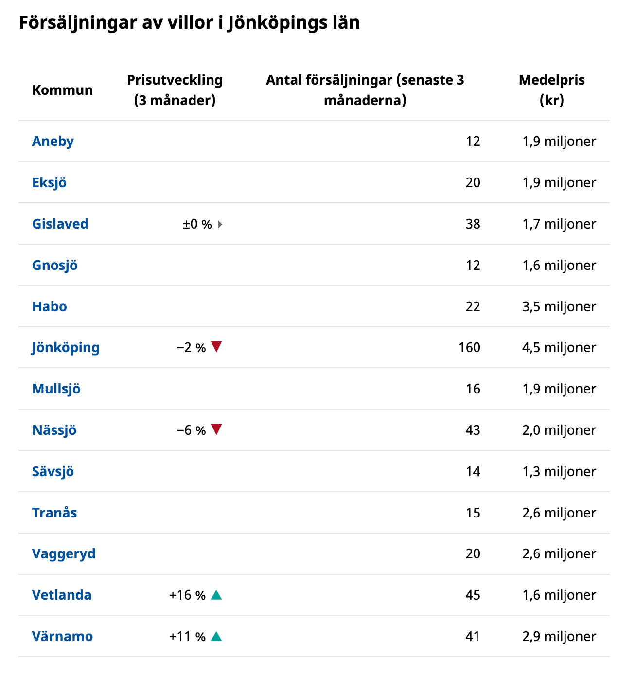 Bland kommunerna i Jönköpings län stiger priserna på villor i två av fem kommuner (där det redovisats uppgifter om prisutveckling). Störst var ökningen i Vetlanda där priserna steg med 16 procent. I Nässjö däremot sjönk priserna med 6 procent. Notera att det på grund av få försäljningar saknas uppgifter om prisförändringar för villor i åtta av länets 13 kommuner.