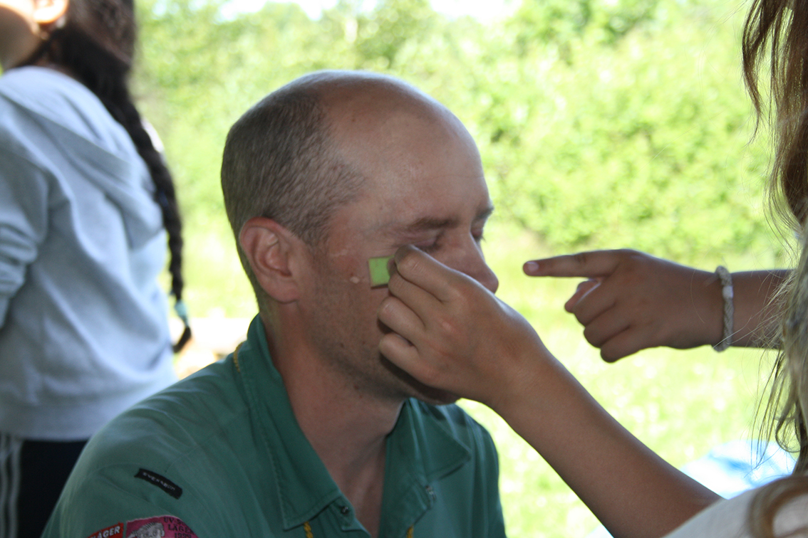 I svenarumsbyn är barnen i full färd med att sminka scoutledaren David Nordquist. Han blundar och tillåter.