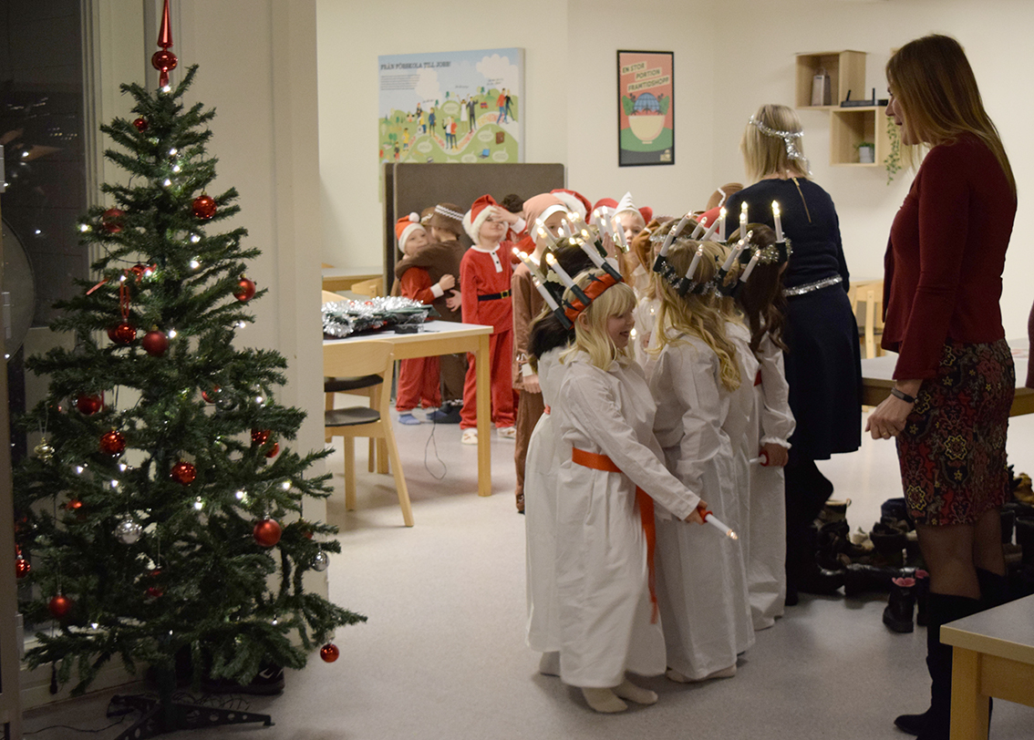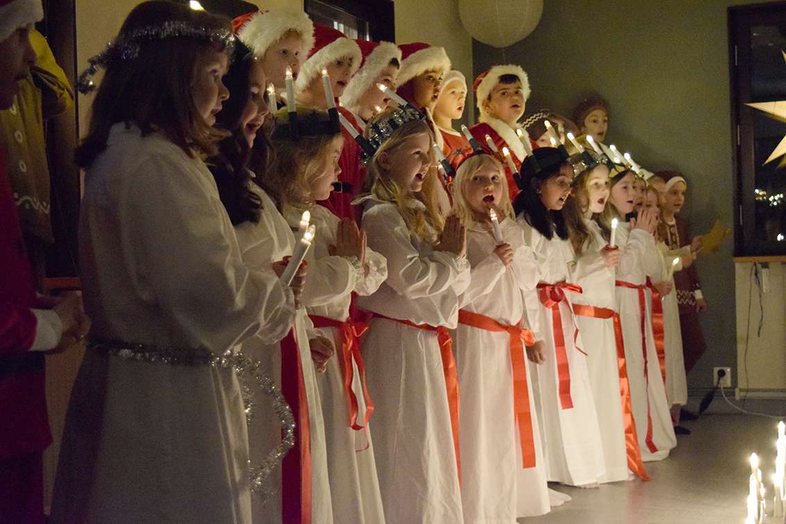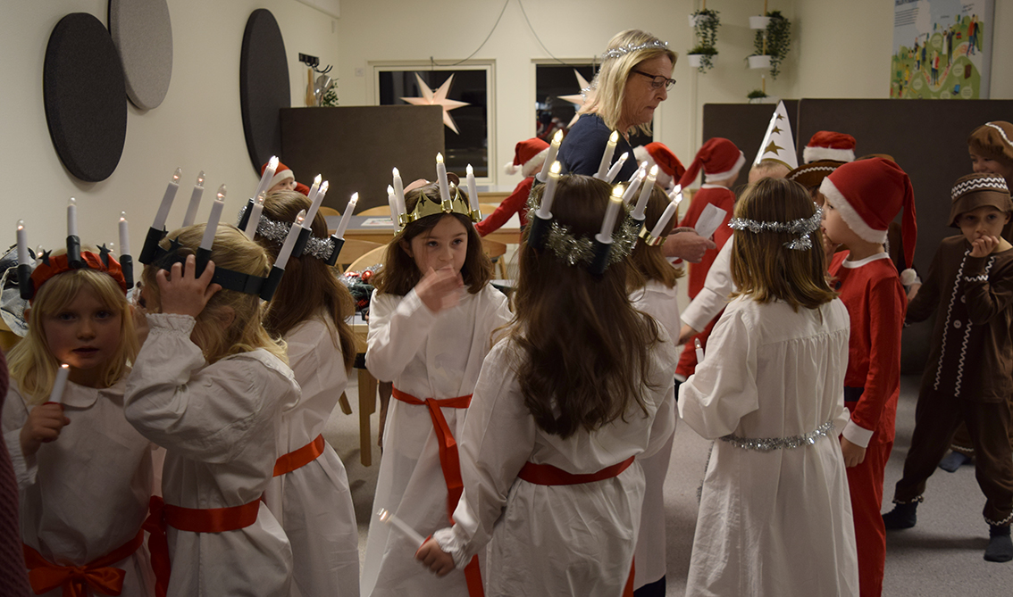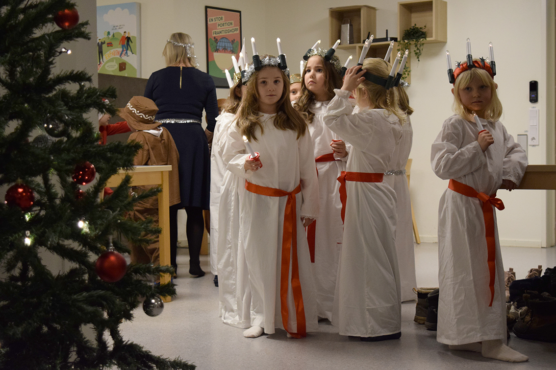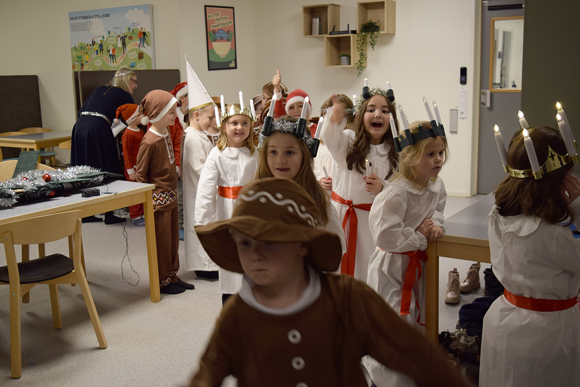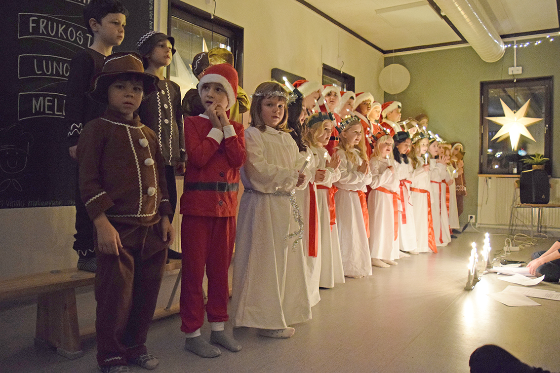 – Eleven fick vara vad man ville så här är flera lucior, tärnor, någon stjärngosse, pepparkaksgubbar, pepparkaksgummor, tomtar och en julgran. Eleverna växer, de känner sig stora och duktiga inför alla som kommer här i kväll. Vi väntar en stor publik, över hundra personer har anmält sig. Det blir en stor publik ikväll. Våra fyra klassföräldrar har köpt in saft och muggar och kommer att hjälpa till med fikat här efteråt, berättar Anne.