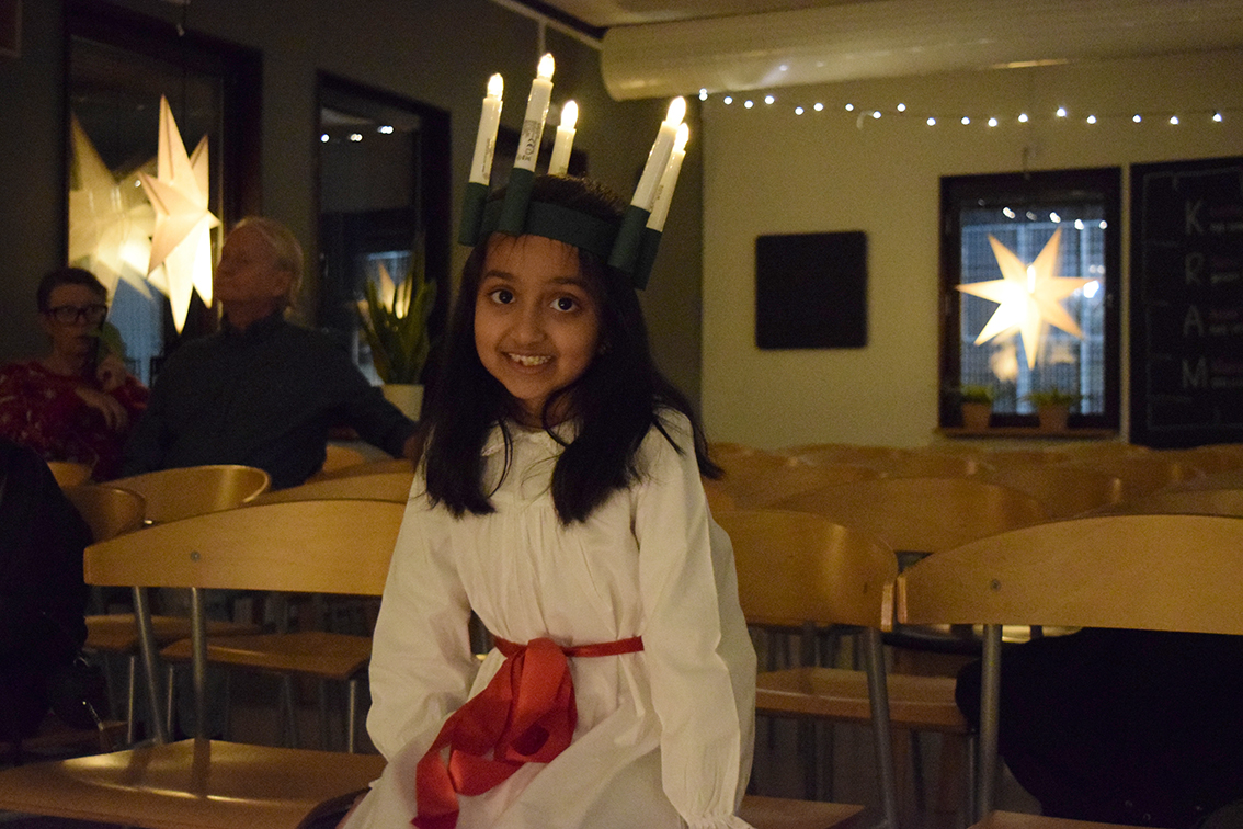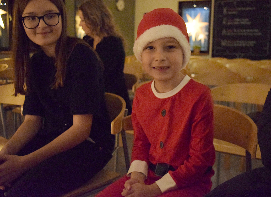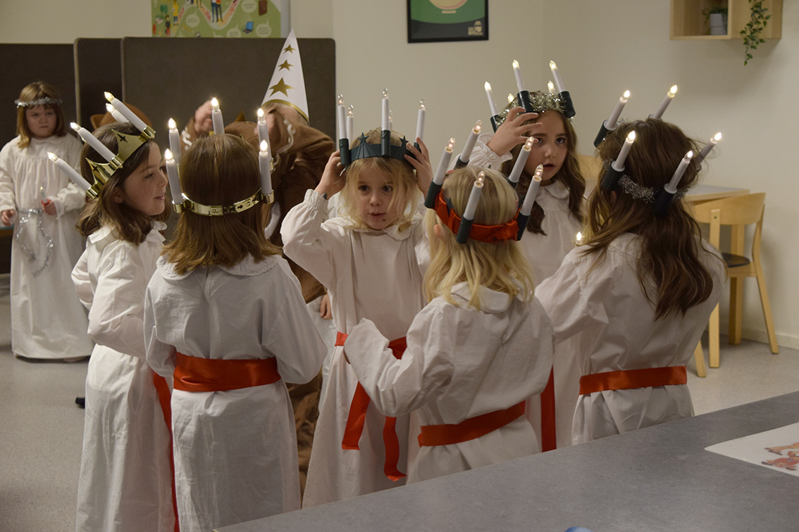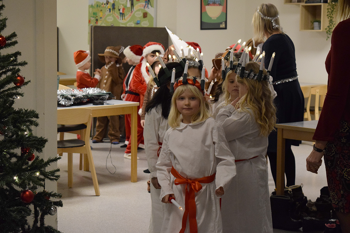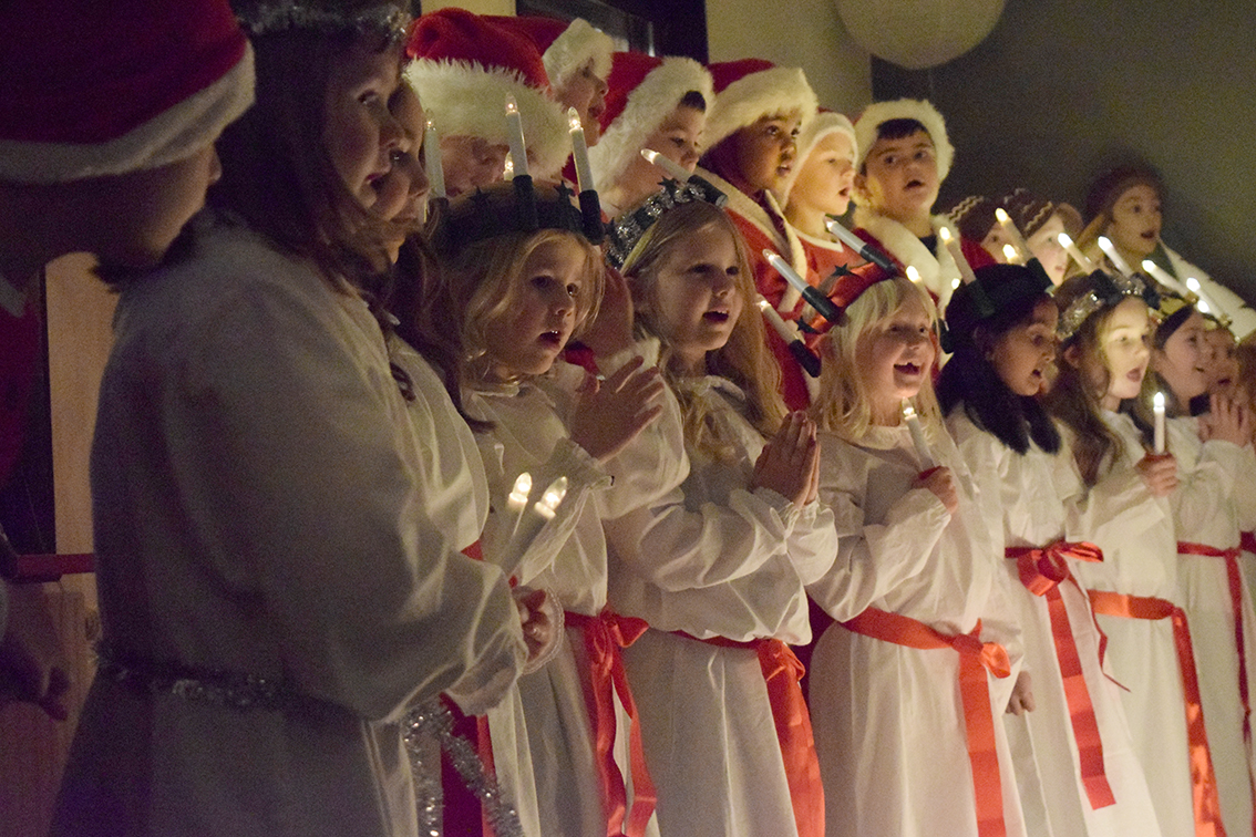 – Eleven fick vara vad man ville så här är flera lucior, tärnor, någon stjärngosse, pepparkaksgubbar, pepparkaksgummor, tomtar och en julgran. Eleverna växer, de känner sig stora och duktiga inför alla som kommer här i kväll. Vi väntar en stor publik, över hundra personer har anmält sig. Det blir en stor publik ikväll. Våra fyra klassföräldrar har köpt in saft och muggar och kommer att hjälpa till med fikat här efteråt, berättar Anne.