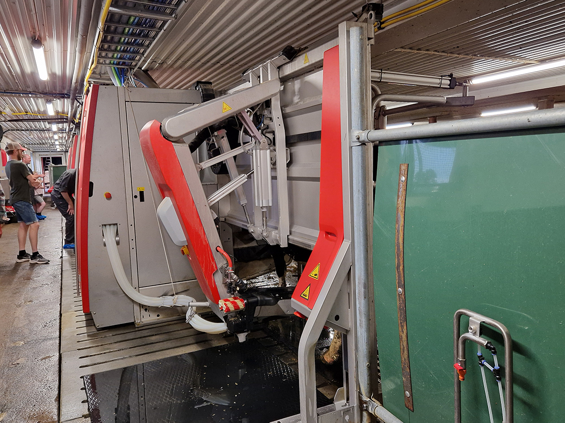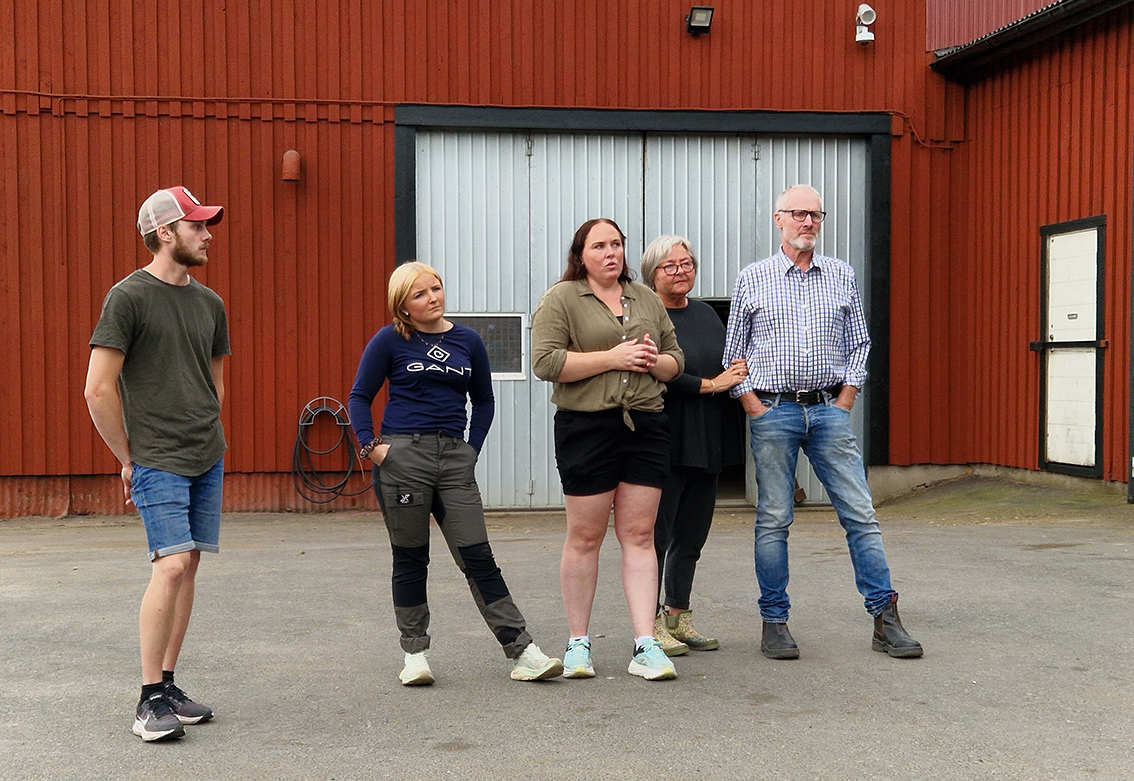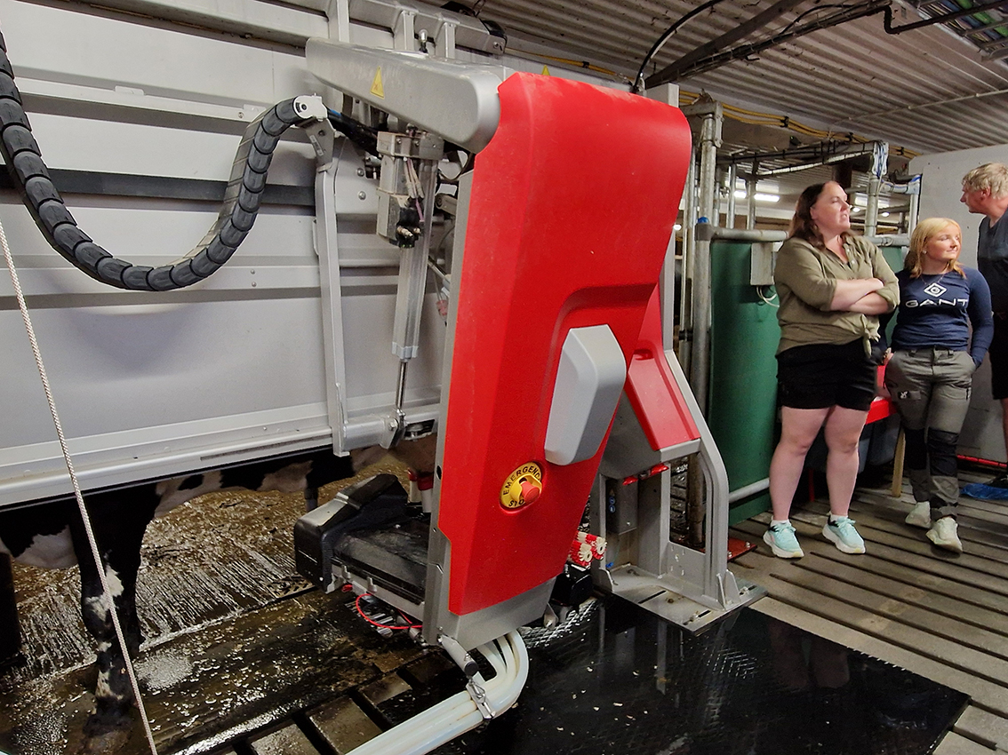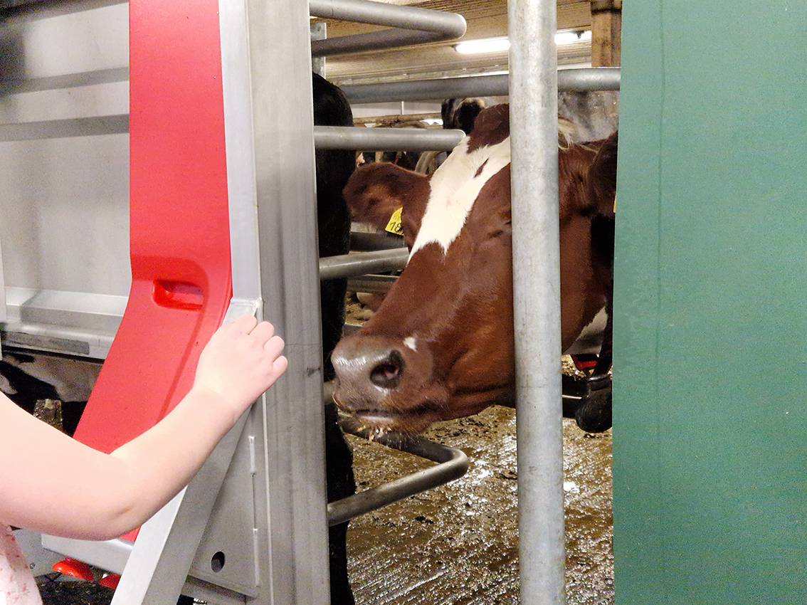 LRF-sällskapet delade upp sig, tossor på skorna togs på och en rundvandring gjordes inne i ladugården. Julia och Alice berättade om hur robotarna fungerar och flödet in och ur robotarna. Julias pappa, Tomas, är nöjd med ombyggnationen och generationsskiftet och kommenterar "Nu har jag gått ner till 150 procent. Väldigt roligt att bygdens barn är här och jobbar".