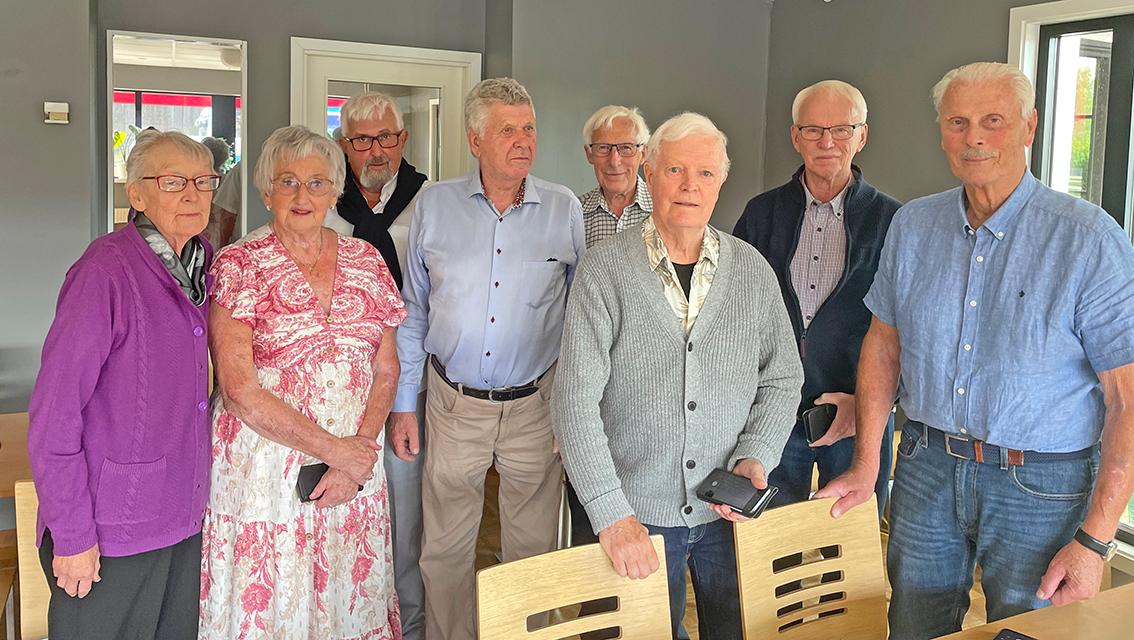 Åtta tidigare klasskamrater som tog examen från Åkers skola 1955. Bild: Sara Mejving