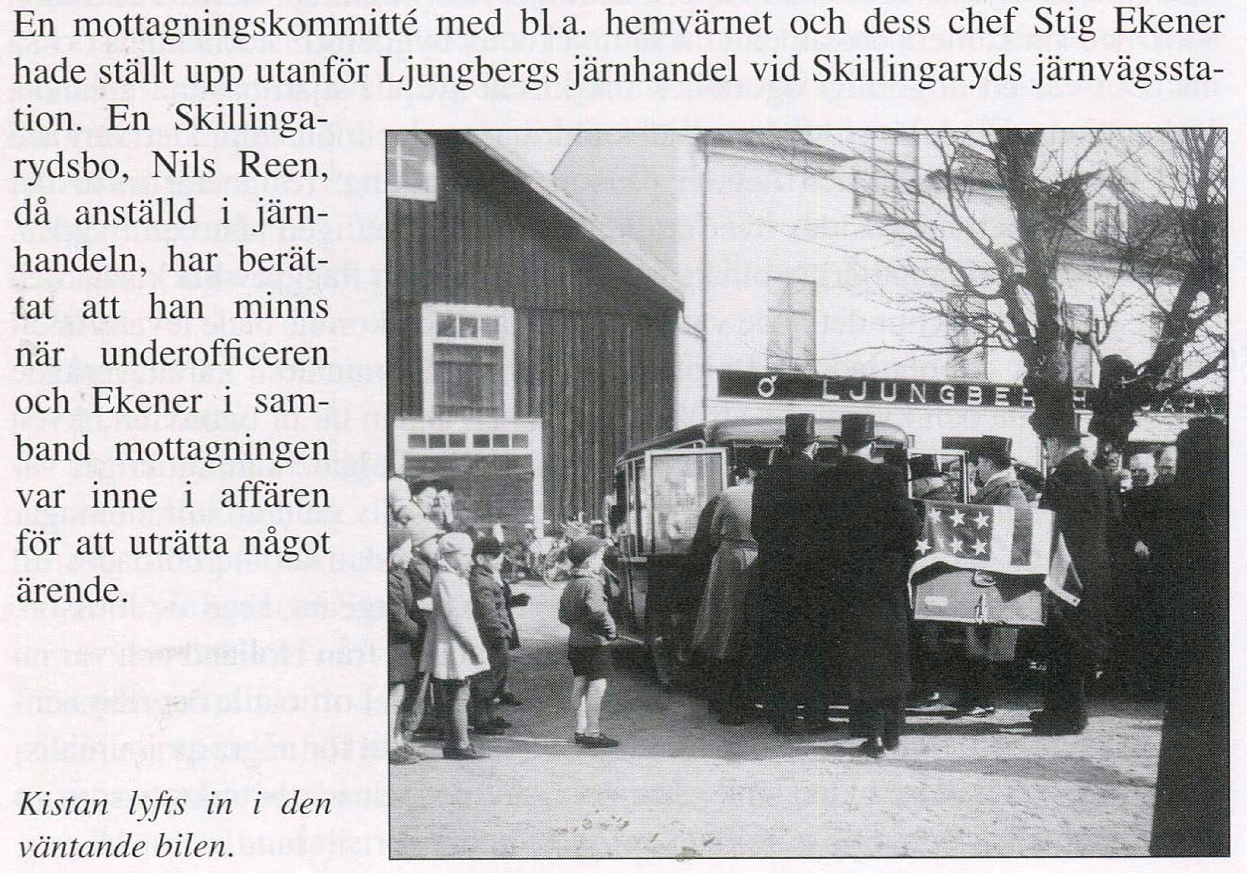 I boken är det många spännande berättelser och en av dem har anknytning till Skillingaryd och Tofteryd. Den handlar om Eric Leander, svensken som hade utvandrat till Amerika och som var en av dem som stupade i uppgörelsen med nazisterna.
