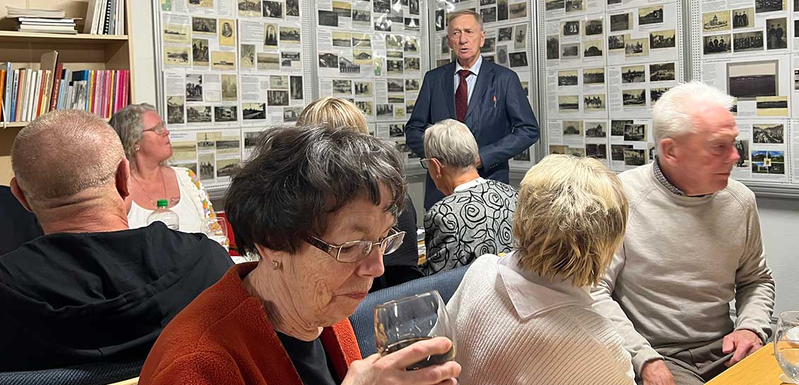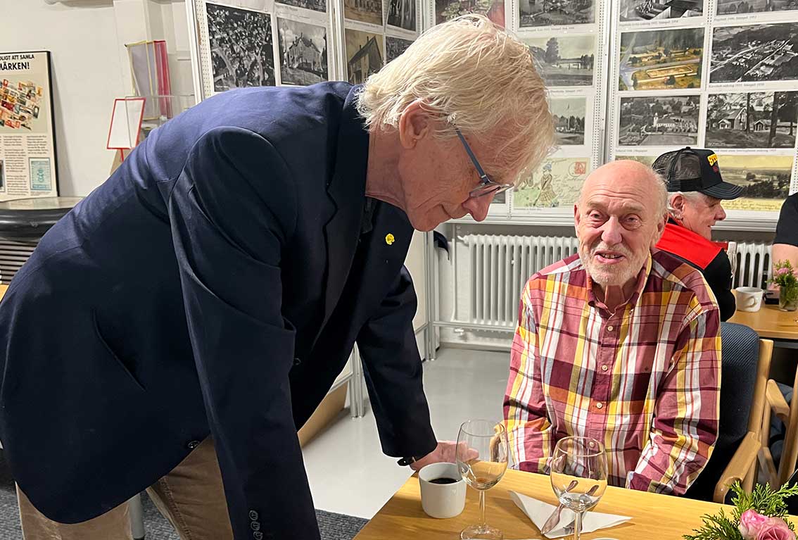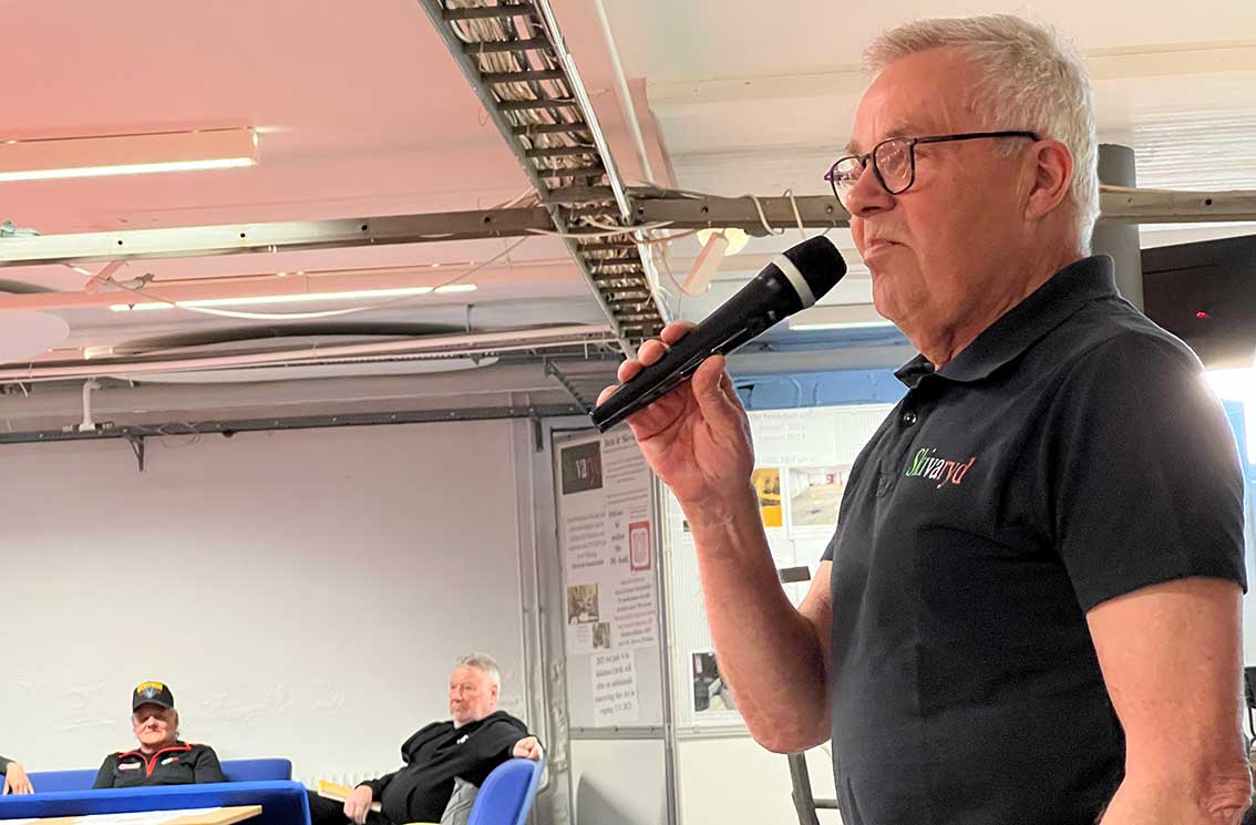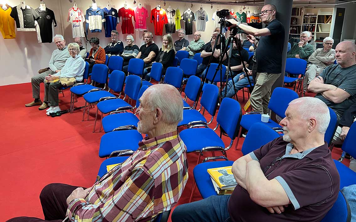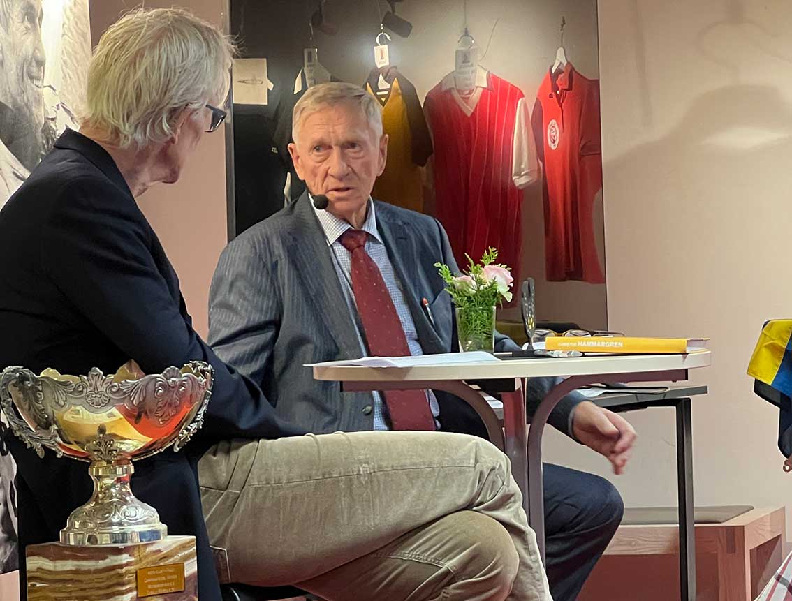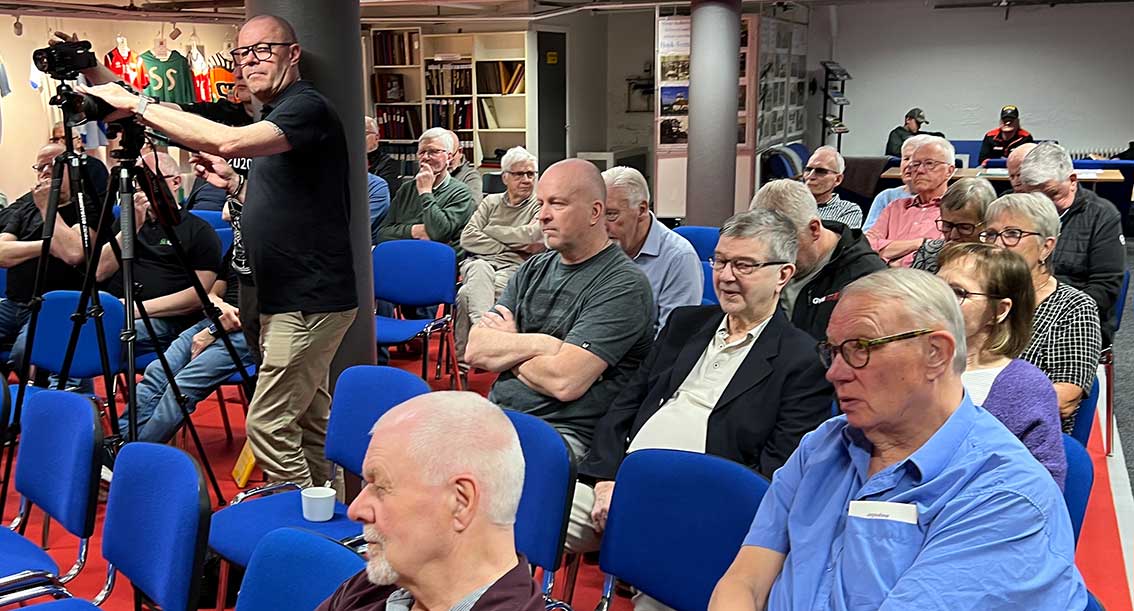 Nästan på utsatt tid var det dags för intervju med mera och ett 80-tal personer hade bänkat sig. Skivaryds ordförande Per Bunnstad välkomnade och därpå var det medarrangören RF SISU Smålands tur. Ordförande Roger Ödebrink tackade för allt arbete med boken och att man i många sammanhang får stötta Skivaryds idrottsaktiviteter.