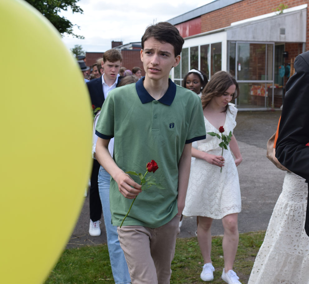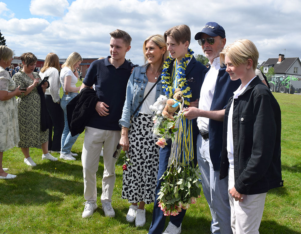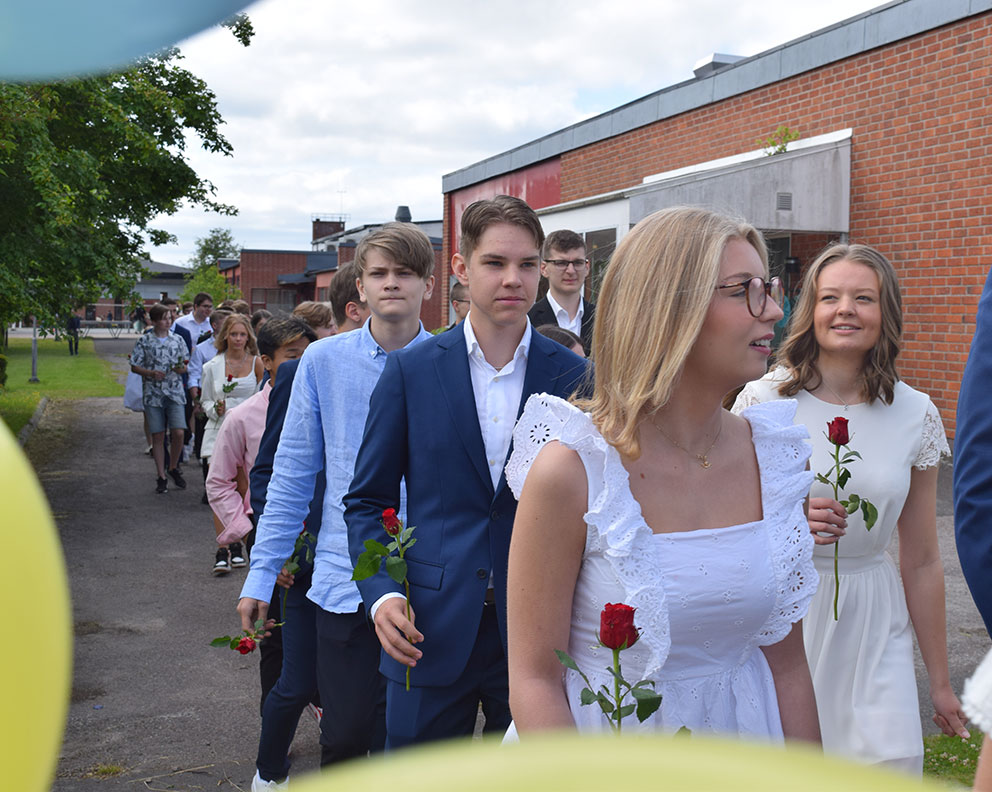 Alina sjöng, det var allsång och lärarna delade ut rosor till 26 elever i årskurs 9A, 23 elever i 9B och 28 elever i 9C. Rektor Helen Kähr önskade alla ett härligt sommarlov och ”Den blomstertid nu kommer” fick avsluta innan färden med svenska flaggan i topp tog med niorna till fotbollsplanen och de väntande…