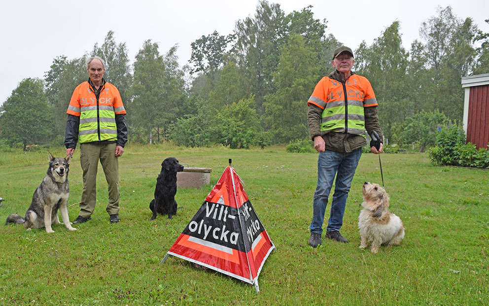 Hur ser uppdragen ut? – Väldigt varierande. Som kontaktperson har vi flera uppdrag. Inte alltid att man som kontaktperson också är eftersöksjägare. Det är vi, och det betyder att vi kan bli kallade till olika platser, behöver inte vara exakt här inom vårt område där vi är kontaktpersoner. För närvarande är det brist på rådjurseftersöksekipage i grannkommunerna exempelvis. Ofta sker viltolyckor i skymningen eller gryningen när de andra som arbetar är på väg till jobbet. Då passar det bra att ringa oss, säger de daglediga Åke och Ingemar och skrattar till.