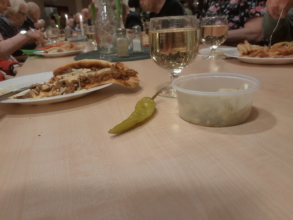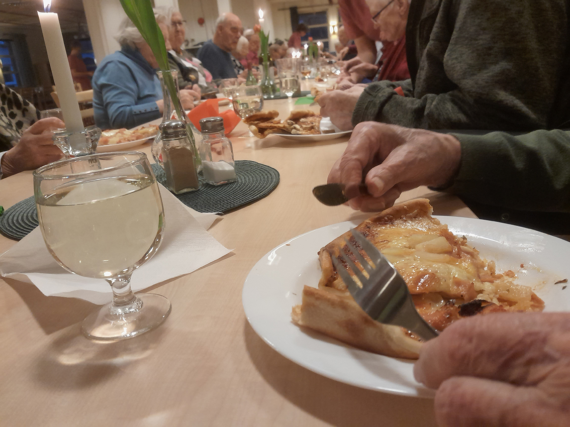 Vid femtiden kom 28 pizzasugna pensionärer som med skratt och glada samtal spred kärlek och värme i lokalen.