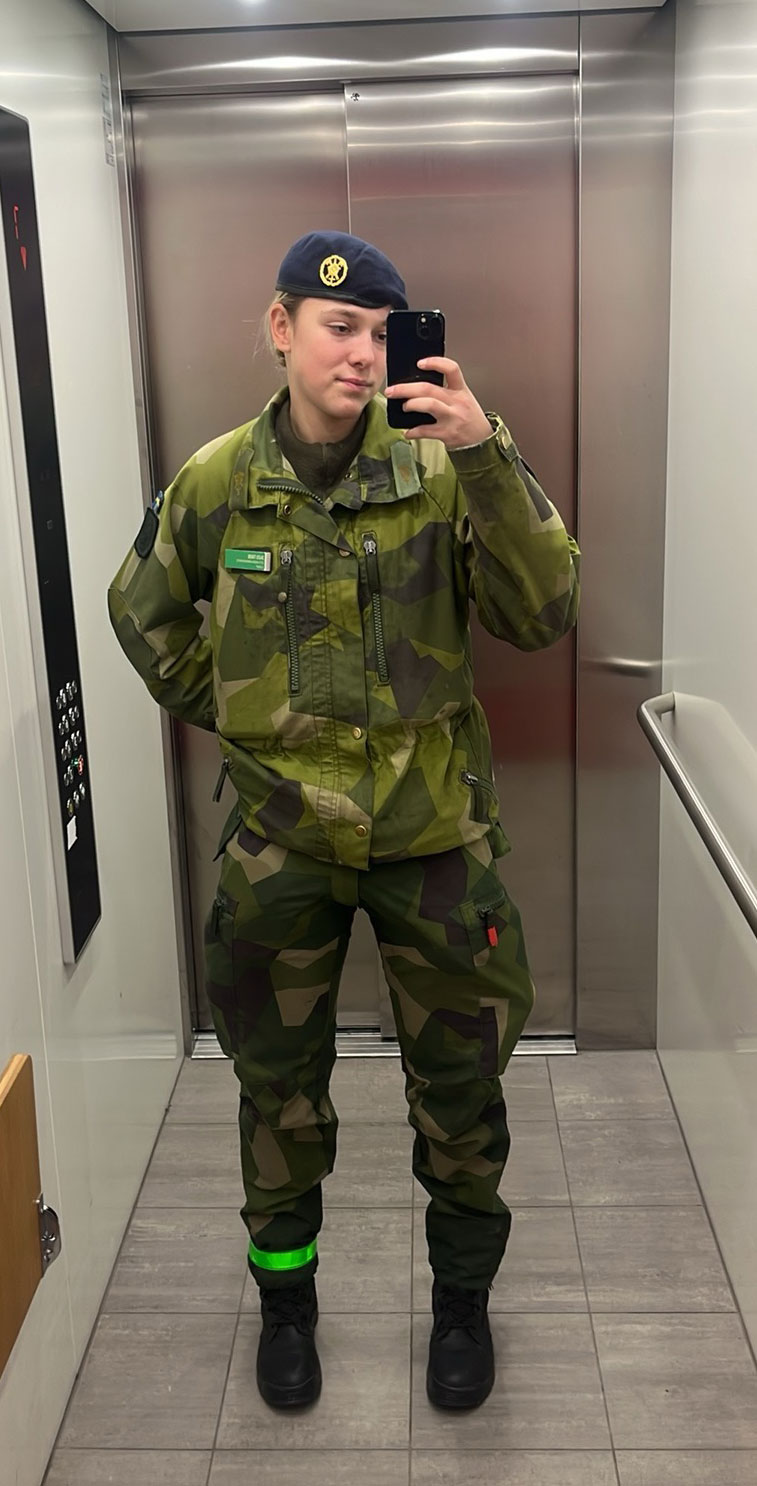 Vad innehåller din tjänstgöring? – Jag lagar fordon. Alla möjliga, från lastbilar till terrängbilar. Det är spännande och väldigt mycket nytt och många olika grejer att lära sig. Vi har haft en grundutbildning i mekanikerutbildning i tio veckor och jag har även fått en lastbilsutbildning på fyra veckor. C-kortet får jag bara använda inom försvaret, ej civilt.