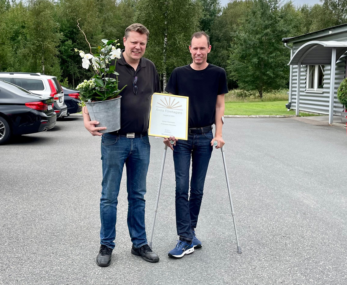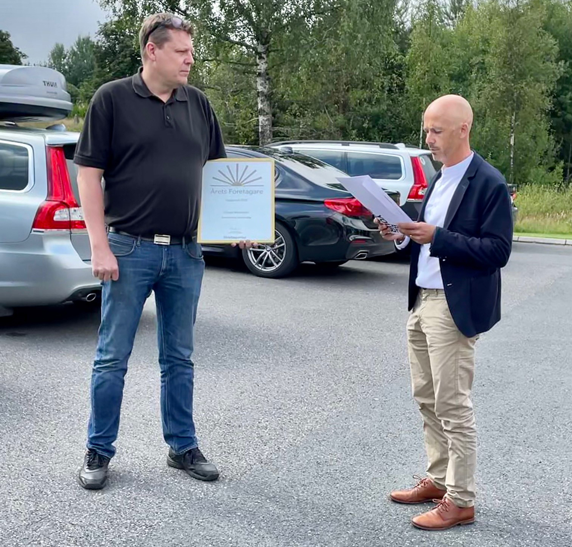 Joel Isaksson som är ordförande i den kommunomfattande (och nybildade) näringslivsföreningen Business Vaggeryd hade bokat in ett vanligt möte med Göran som blev fullständigt överraskad när Joel, representanter från kommunen och Företagarna stod och väntade på honom och delade ut priset för Årets Företagare i Vaggeryds kommun.