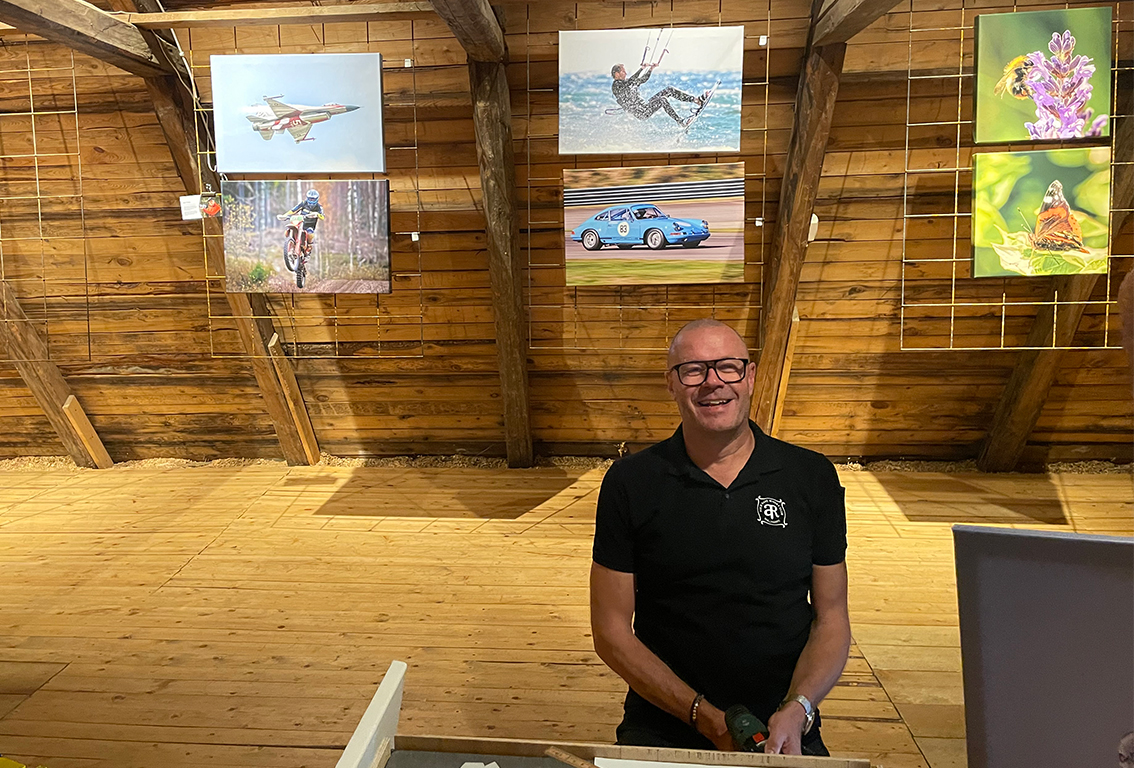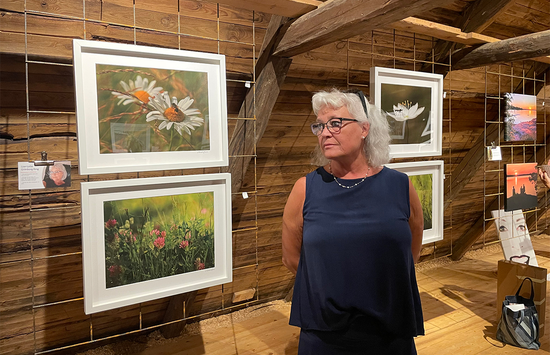 Erik är ljussättare på galleriet. Med hans kunnighet och erfarenhet som ljussättare på länsmuseet sätter han ljuset perfekt menar Carina Grimborg Svensson, en av utställarna på fotoutställningen. Hennes fotografier består av naturbilder i år. Den hon känner för allra mest av sina verk i dag är soluppgången över Rollstorpasjön.