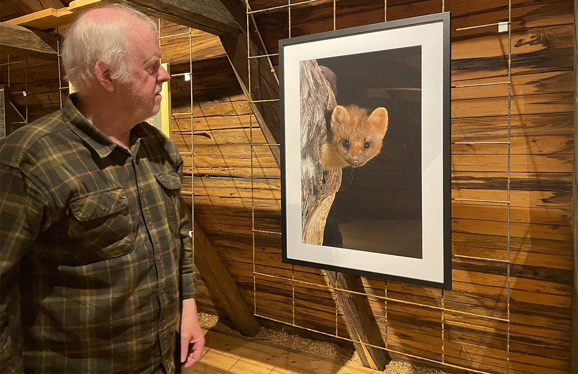 – Det är en mårdhona som jag blev bekant med i skogen. Efter ett par år följde hon med mig fram till huset och ville ha talgbollar. Det fick hon. Sedan ville hon ha annat. Ostkanter gillar hon. Hon tittar ut ur en fågelholk på bilden. Jag har slängt in osten genom hålet där. Och så dyker hon ner och så kommer hon ut.