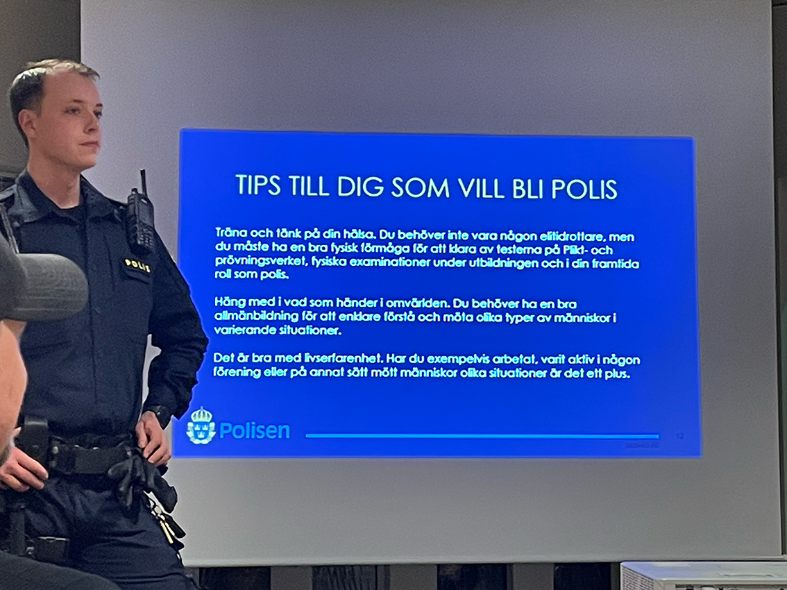 Områdespolis Sofie Fast berättade att det finns många områden att jobba inom på polisen, hur utbildningen fungerar och på vilka sätt man kan läsa. De som var på plats fick också information om vilka kurser som ingår i utbildningen, antagningskrav och prövning. Det blev många tips till den som vill bli polis alltså.