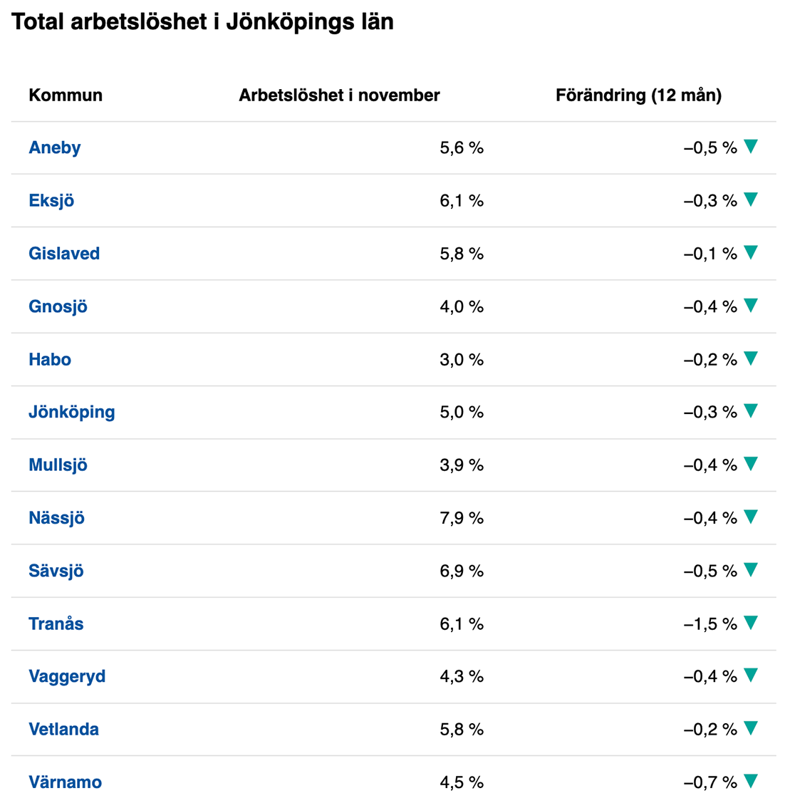 I alla länets kommuner sjunker arbetslösheten just nu. Störst är minskningen i Tranås, där arbetslösheten sjunker med 1,5 procentenheter. I tabellen längre ner ser du utvecklingen i samtliga kommuner i länet.