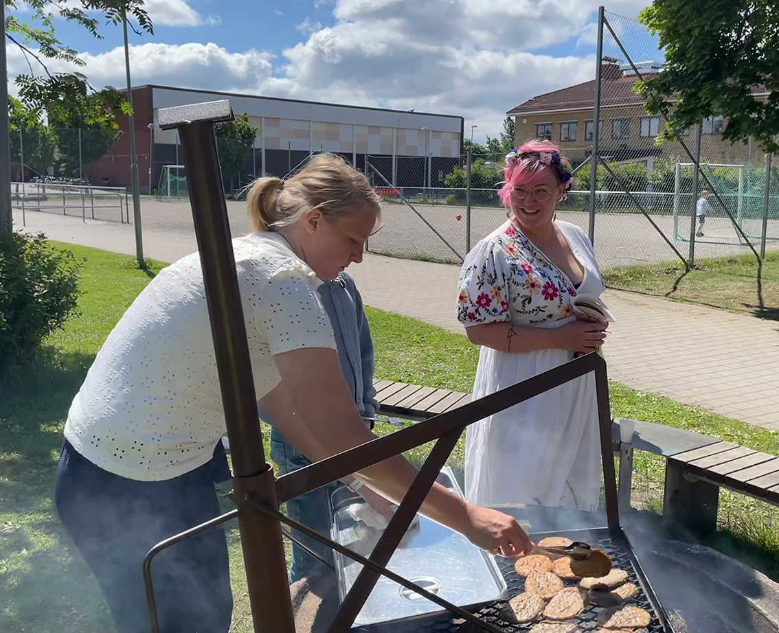 Östra skolans- och Hjortsjöskolans fritidshem grillade hamburgare och åt utomhus samtidigt som niorna hade sin avslutning strax där intill.