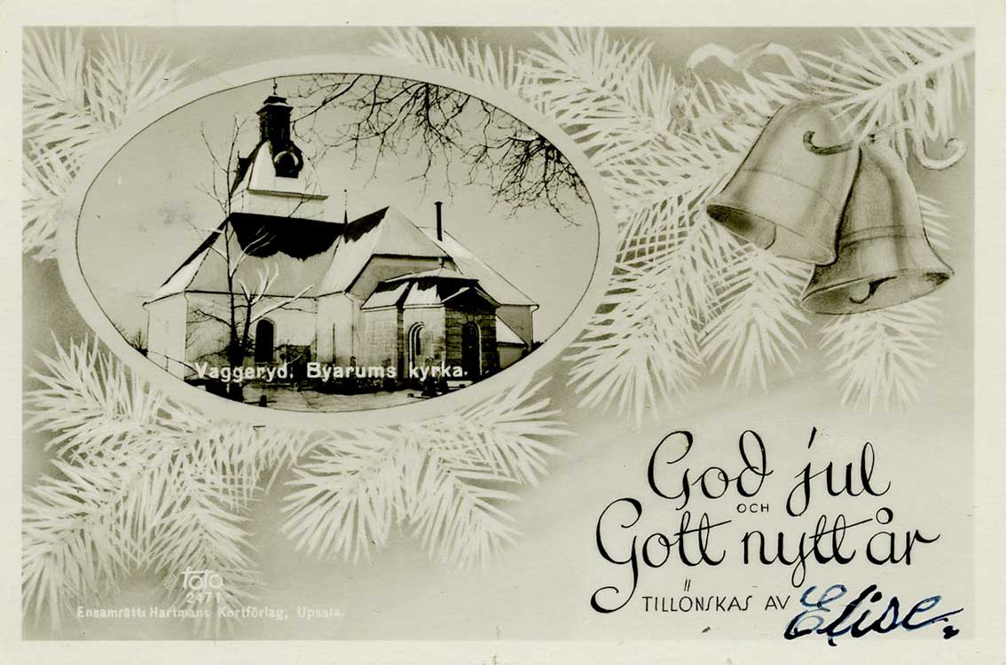 Innehållet är ett julkort som en gång tecknades av Jenny Nyström (1854–1946) som var vår mest folkkära julkortskonstnär. Erik använde stämpeln på redaktionen och han själv och Kåre skrev under.