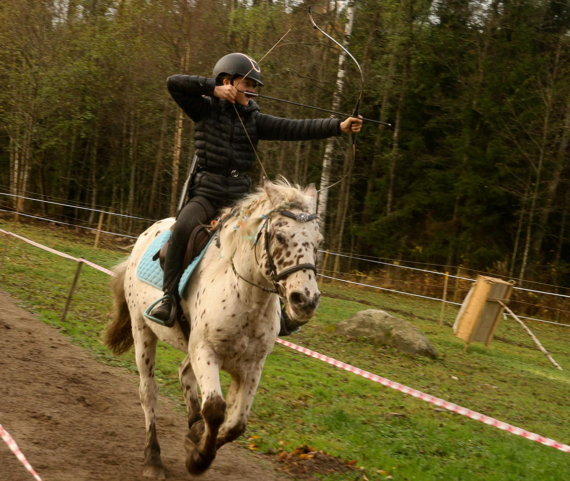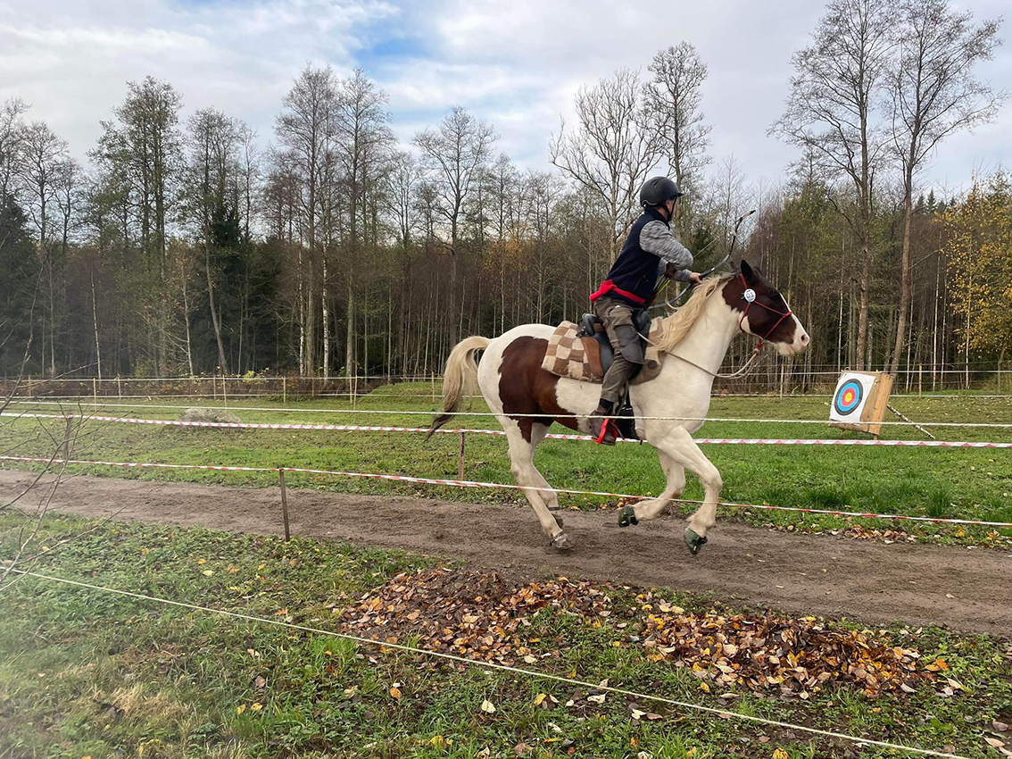 – Två olika grenar tävlar vi i. Den ena heter ”Raid” då man skjuter på två till tre olika tavlor, en pil på varje tavla. Den andra heter ”Tower” som är en lite högre måltavla som man får skjuta så många pilar man kan på sträckan på 90 meter som rids i galopp. Den sträckan rider man ungefär på 16 sekunder. Tävlingen är för alla åldrar och för både tjejer och killar. Poängsystemet är upplagt så att om du rider långsamt men är en jätteduktig skytt så kan du placera dig lika bra som en som rider riktigt fort men är något sämre skytt.