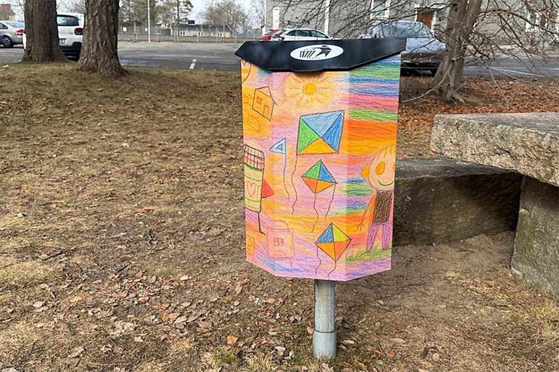 Med inspiration från förskolebarnens egna teckningar, och med stöd från personal på tekniska kontoret, har kommunens första färggranna papperskorg nu kommit på plats vid lekplatsen utanför Folkets Hus i Vaggeryd. Barnen fick själva vara med vid monteringen och invigningen.