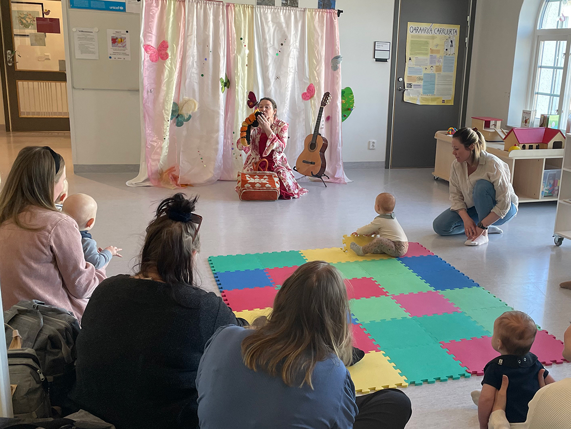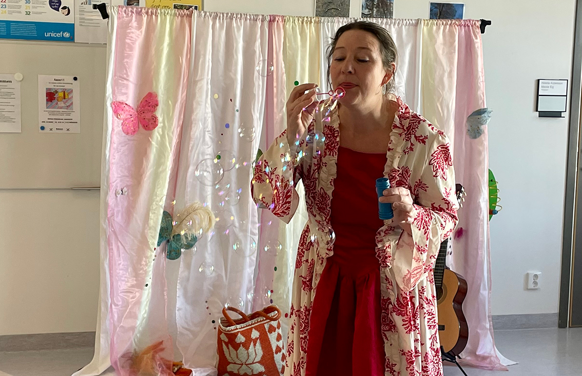 – Det är en kommunikation mellan mig och den här unga publiken som bygger på händelser. Det finns egentligen ingen röd tråd utan det är nog så som bebisar ser världen, det är här och nu och i en takt som de hänger med. Detta varvas med en folkmelodi som man känner igen, fortsätter hon.