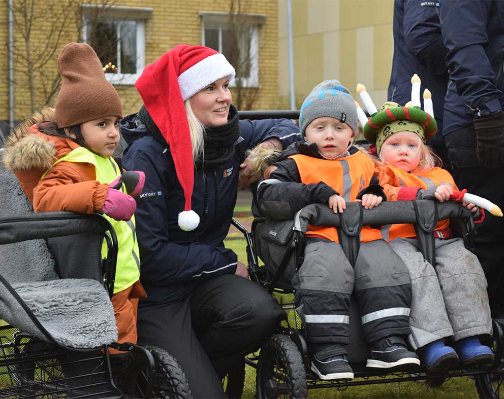 – Vi ska sjunga några luciasånger, säger pedagogerna och barnen, i det småregnande ruskiga vädret, hade klätt upp sig i fina mössor. Alltifrån luciakronor och pepparkaksfärgade mössor till luciaklänningar och tomteluvor.