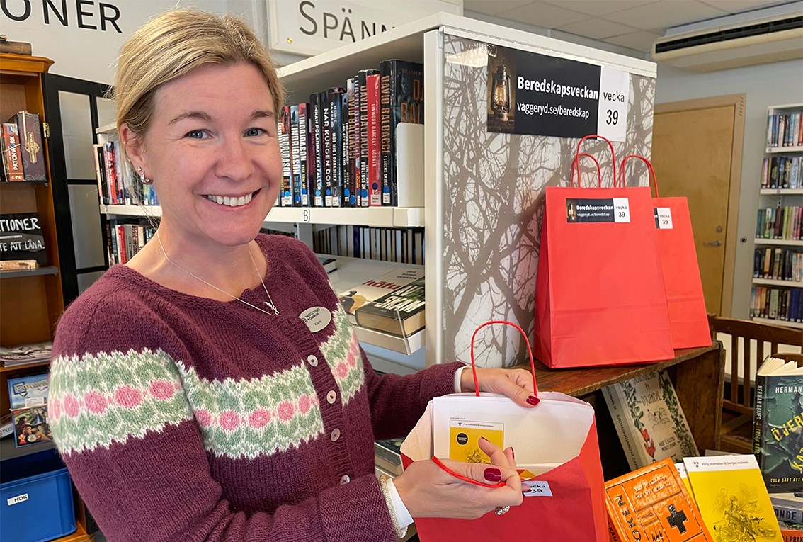 På biblioteken har man den här veckan rustat med broschyrer och material kring beredskap och ”prepping” alltså att vara förberedd. Där kan man gå och läsa och lära sig mer. Vi styr stegen från brandstationen till bibblan.