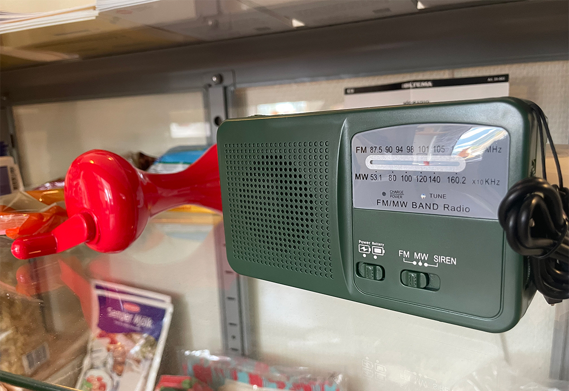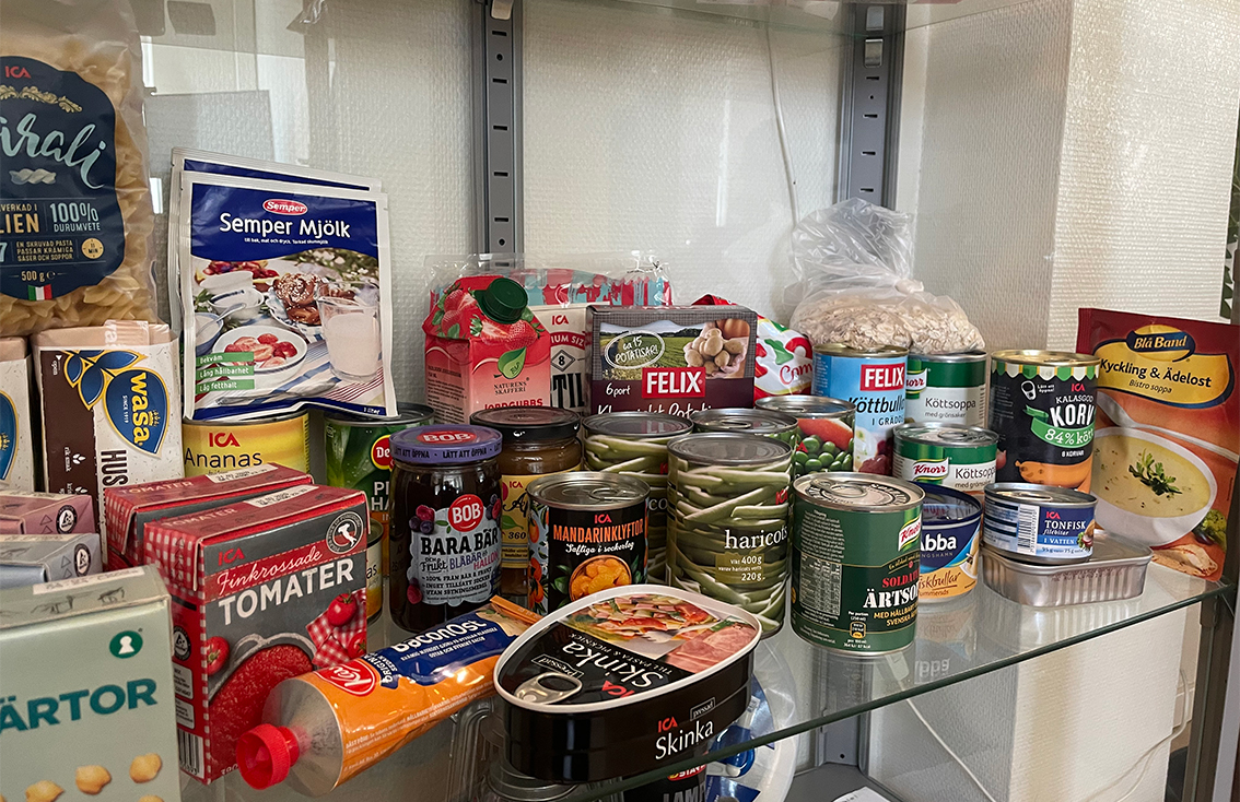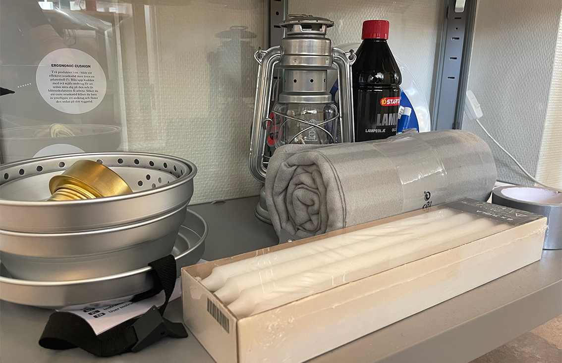 Hon visar oss ett skåp fullt med saker som är bra att ha hemma för att känna sig trygg. Det är stormkök, filt, ljus, tändstickor, en radio, ficklampa, och så en massa mat. Rekommendationen är solklar: köp sån mat som du gillar i normala fall och det är inte så svårt att bygga upp ett litet lager.