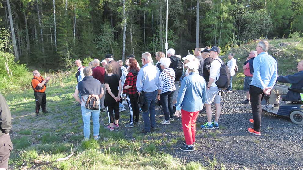 Ungefär 45 personer mötte upp och lyssnade till Dan Damberg och Hans Boberg när de berättade om fåglar och blommor som finns i området. Till vänster på bilden ser vi Dan och Hans och längst till höger Sven Folkesson som gjorde sin sista skogsutflykt tillsammans med sina vänner.