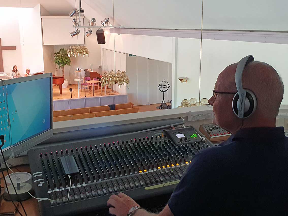 När vi tittade in hur det såg ut vid sändningen av gudstjänsten den 31 maj stötte vi på dagens tekniker Olliver Axelsson, Martin Lönnheden, Patrik Elg och Christer Gustafsson. Minst fyra personer går det alltså åt för att sköta tekniken vid varje webbsändning. Andra som hjälpt till vid tidigare sändningar är Martin Elg, Johan Axelsson, Karl Lindoff, Kent Gustafsson och Mats-Eric Fransson.