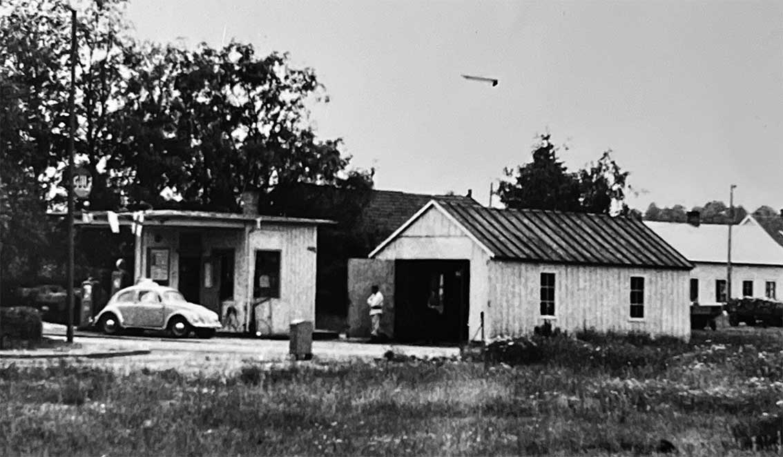 Ragnar Larsson övertog 1954 denna mack och byggde nytt snett över Storgatan och flyttade dit. Så småningom startade han Ragges Gatukök som blev en populär samlingsplats.