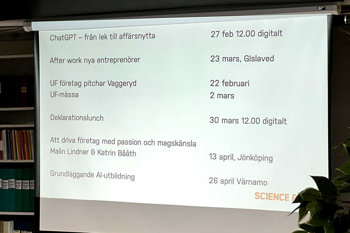 Det var även en del föredrag och diskussion. Från kommunen medverkade Simone Kamm, samordnare i näringslivsfrågor, handel och besöksnäring, Johan Thorsell, näringslivschef och Elin Ohlsson. Elin är är affärsutvecklare för Science Park i Vaggeryds kommun. Hon arbetar med företagsstarter, idéutveckling och utveckling av befintliga bolag. Hon jobbar halvtid i Mullsjö kommun och halvtid i Vaggeryds kommun.