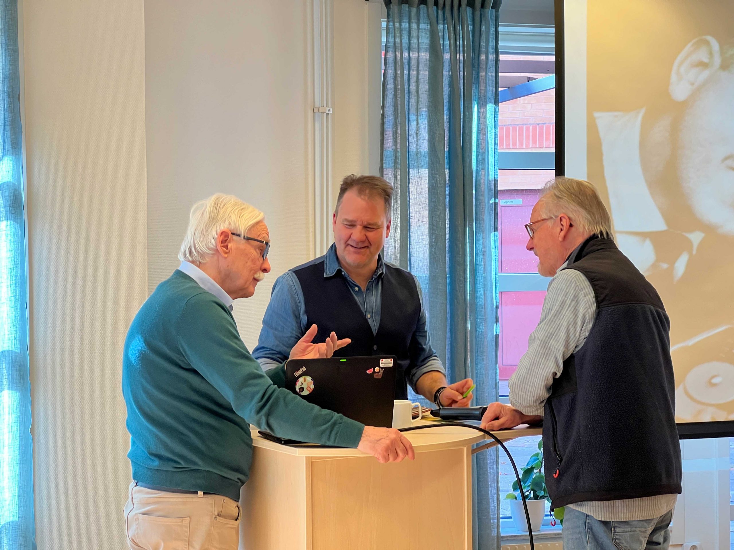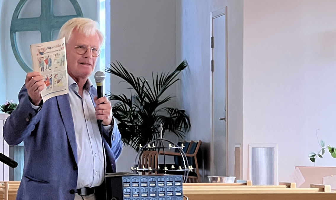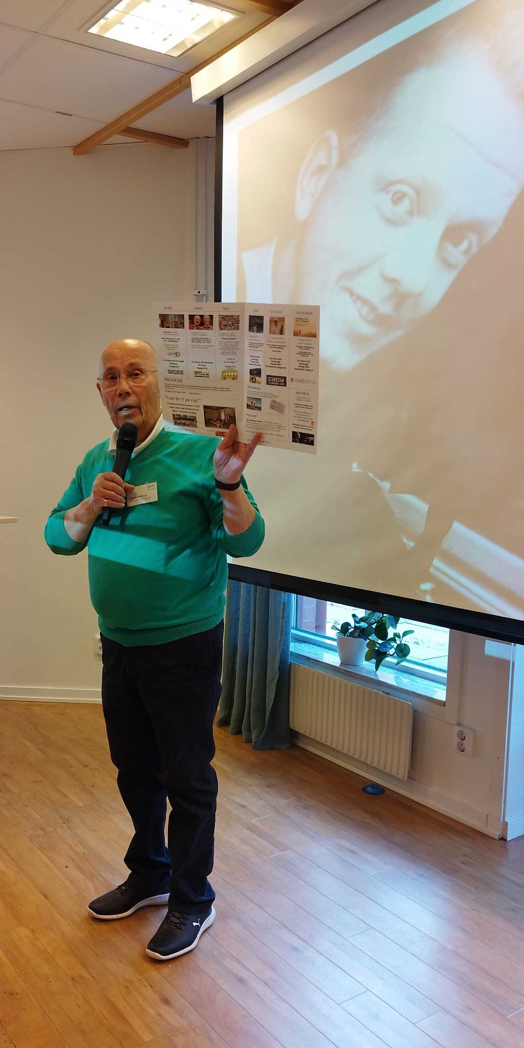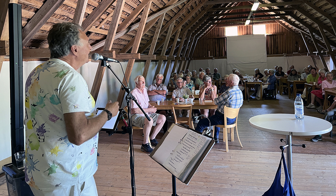 Niklas Löfström, bördig från Vaggeryd och nu boende på Ekerö, berättade engagerat om Hasse & Tage. ”Glädje och satir i ord, musik och bild med Hasse & Tage ” var rubriken på Niklas mycket uppskattade kåseri. Han berättade i kronologisk ordning om deras uppväxt i Helsingborg respektive Linköping, samarbetet på Sveriges Radio och hur de startade AB Svenska Ord.
