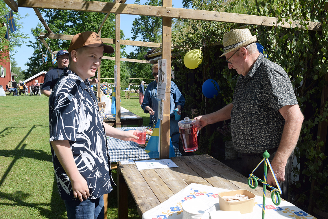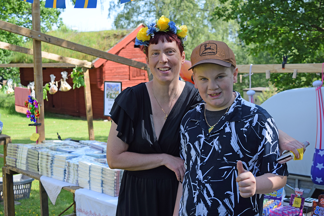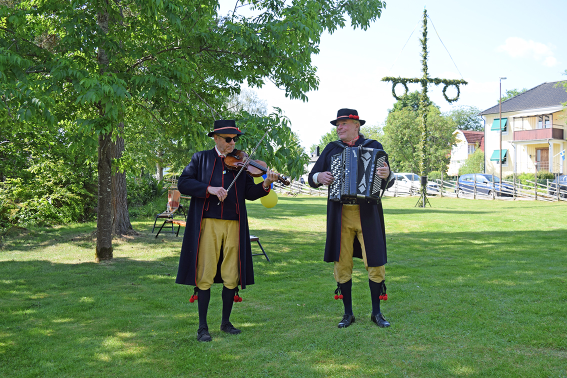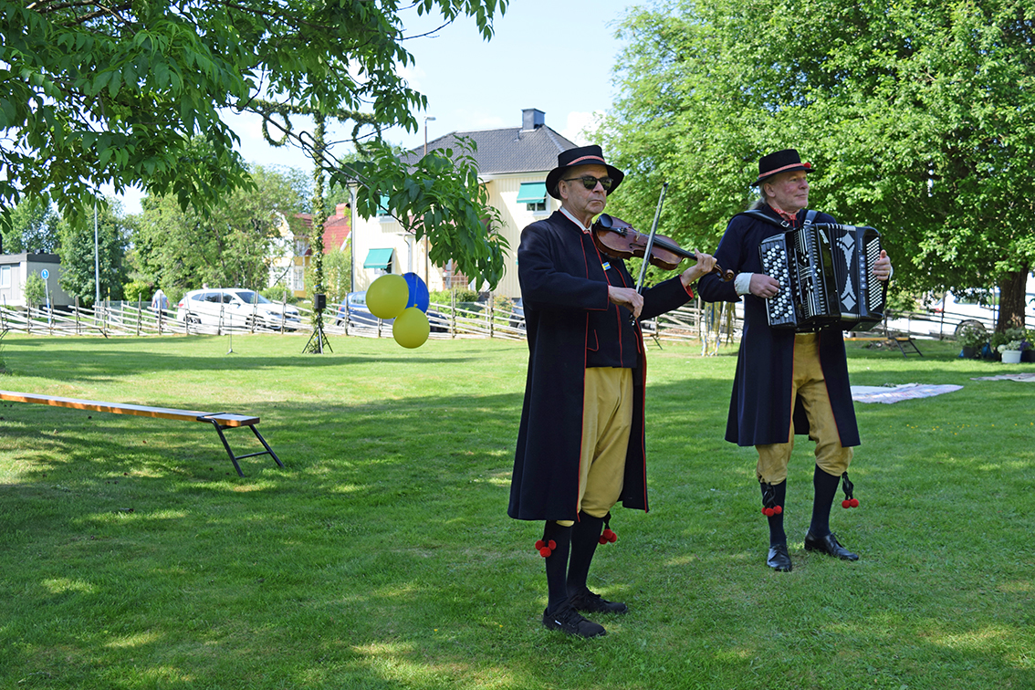 Mart och Gabriel från Jönköping fanns på plats i hembygdsparken med folkdräkten från Rättvik ramade in midsommarfirandet med fiol och dragspel. Parken var smyckad i minsta lilla detalj och här fanns något för både ung och gammal.