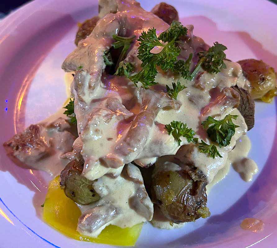 Varmrätt: Högrev med närodlade rotfrukter och inlagda gulbetor som serverades med kantarellsås