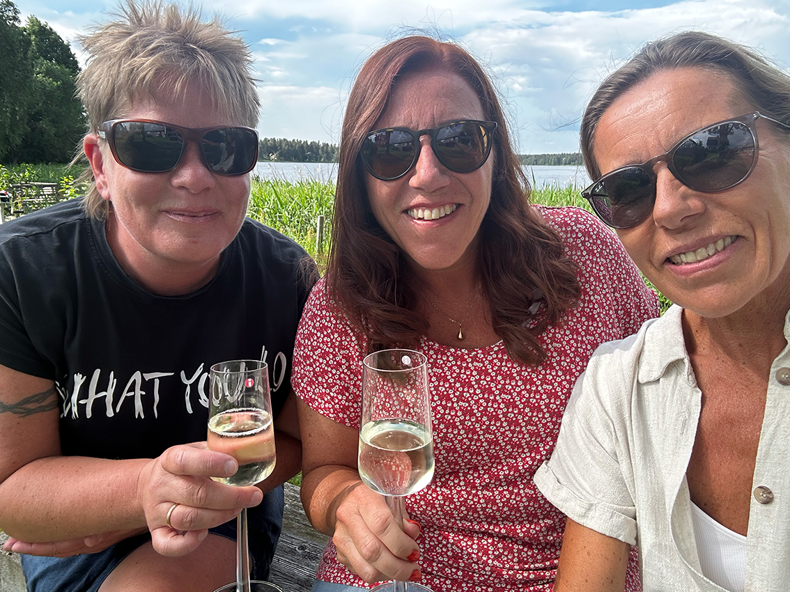 Bubbelprovning en härlig sommarkväll. Sara Mejving, Martina Ojala och Viveca Åberg.