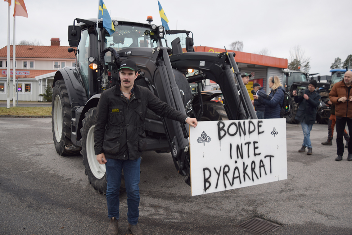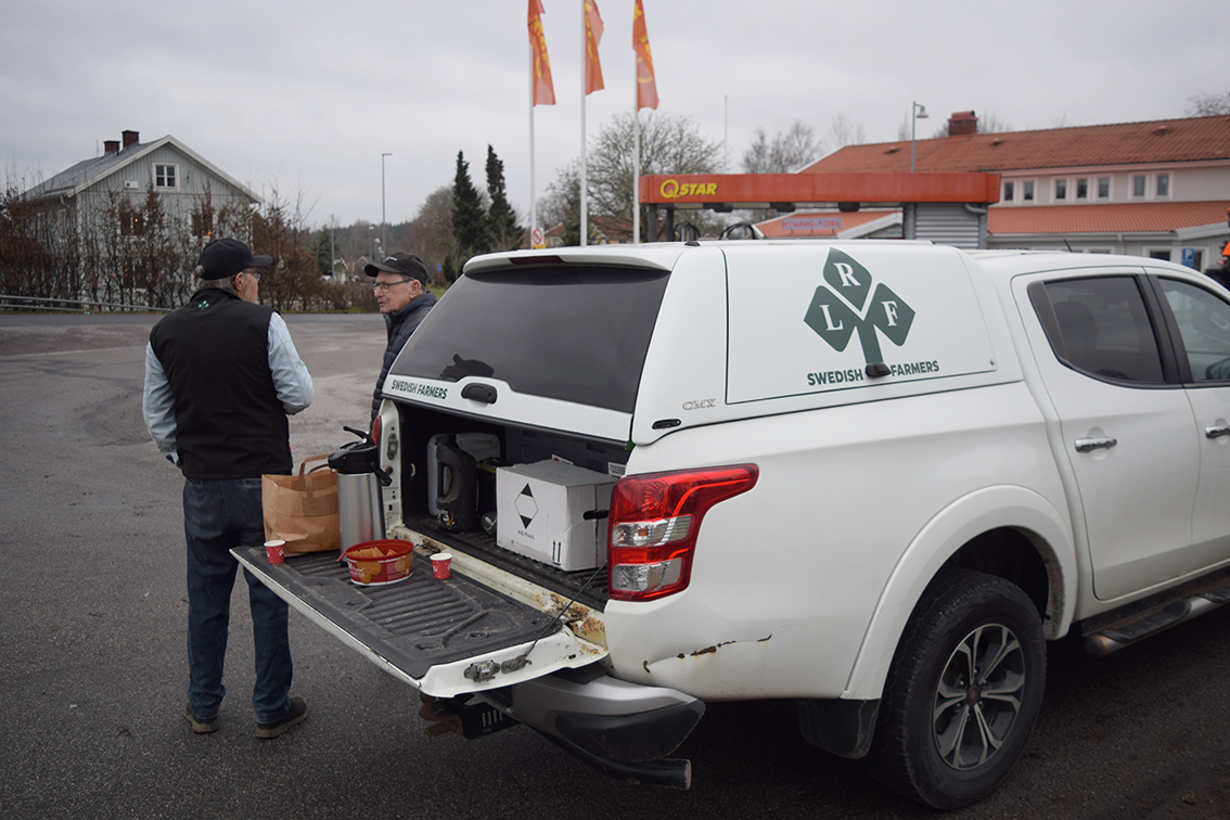 Adam Gruvaeus från Vara är spannmålsodlare och sitter med i regionstyrelsen i Västra Götaland. Han väntade in Henrik från Östergötland, i Hok. Med sig i följebilen fanns diverse reservdelar som kan tänkas behövas under färden, samt pepparkakor och glögg. Adam är en av de fyra som kommer att köra följebil och framför allt traktorn ner till Bryssel. – Det här är viktigt för att visa vårt deltagande i den protesten som arrangeras av lantbruksrörelsen runtom i Europa. Den här demonstrationen genomförs till största del för att de vill skära ner jordbruksstödet, men även i handelsavtalet och ökat regelverk. Det är första gången som vi kör en traktor ner till Bryssel på detta viset. Det här är vi inte vana vid – vi brukar kanske vara mer diplomatiska. Man uppskattar totalt 10 000 lantbrukare där vi från Sverige kommer med en traktor men också 50 svenska lantbrukare på torsdag, berättar Adam.