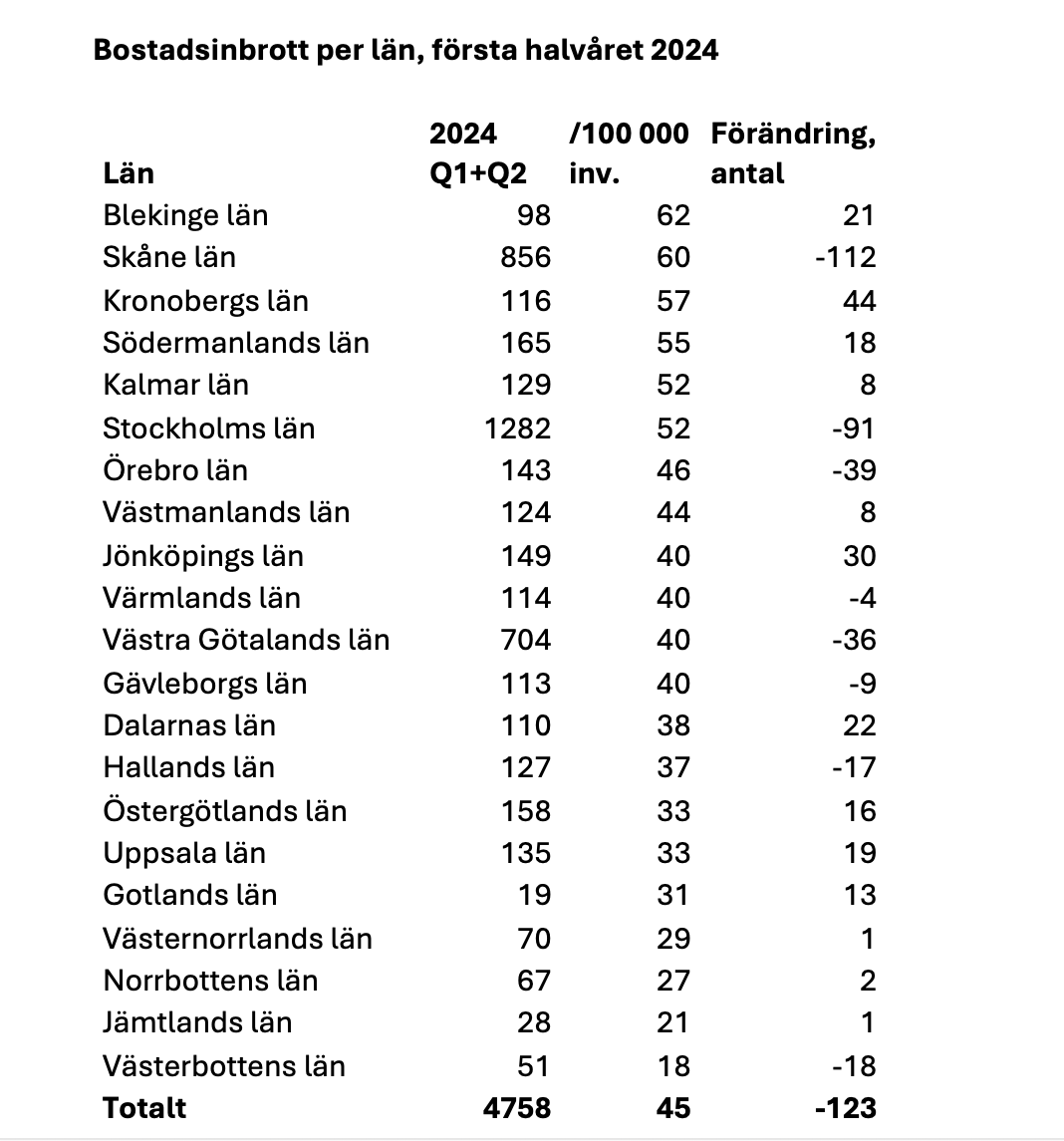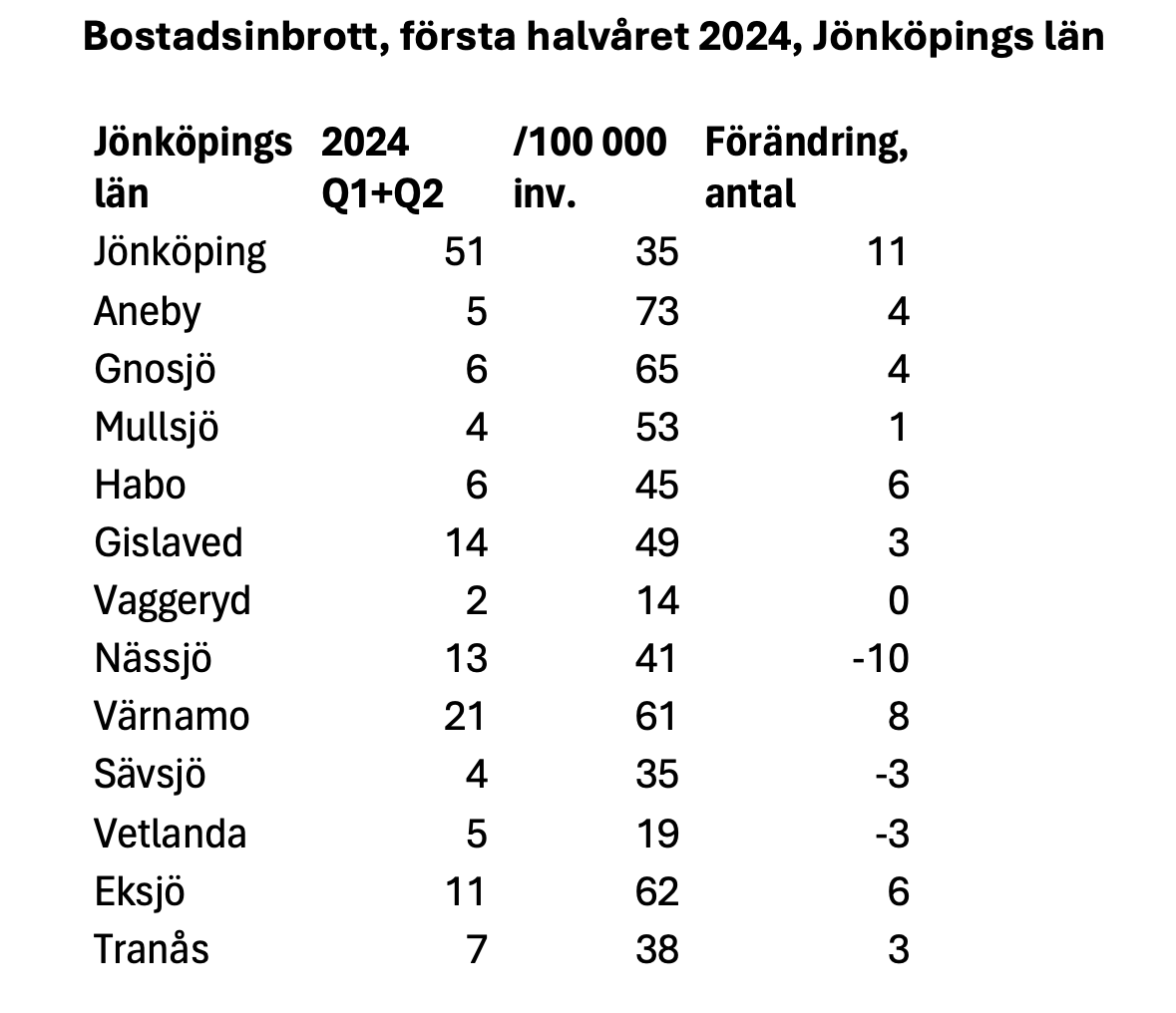 Det är försäkringsbolaget Dina försäkringar som sammanställt statistik hämtad från BRÅ om bostadsinbrott under de två första kvartalen för 2024. I Jönköpings län skedde 149 bostadsinbrott under det första halvåret, 30 fler än under samma period förra året vilket motsvarar en kraftig ökning med 25 procent. I relation till befolkningens storlek rapporterades 40 inbrott per 100 000 invånare i länet.