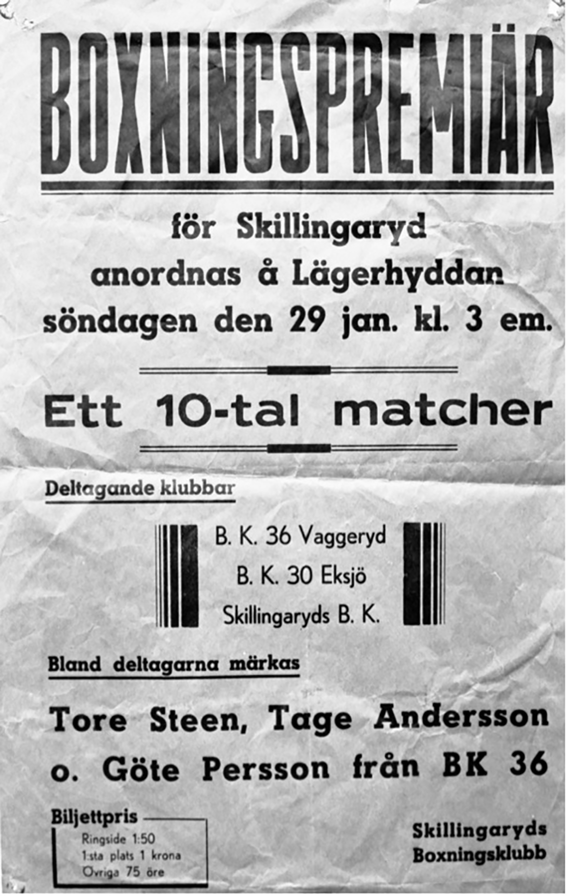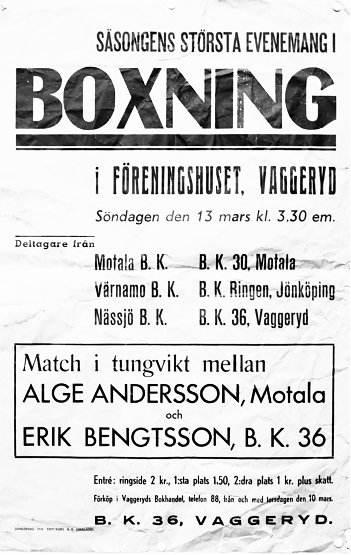 År 1936 bildades boxningsklubben BK-36 i Vaggeryd. Klubben var verksam under cirka tio år och hade stora framgångar med många duktiga boxare. Vid Magnisa Café på söndag visas en film om boxningen i Vaggeryd.