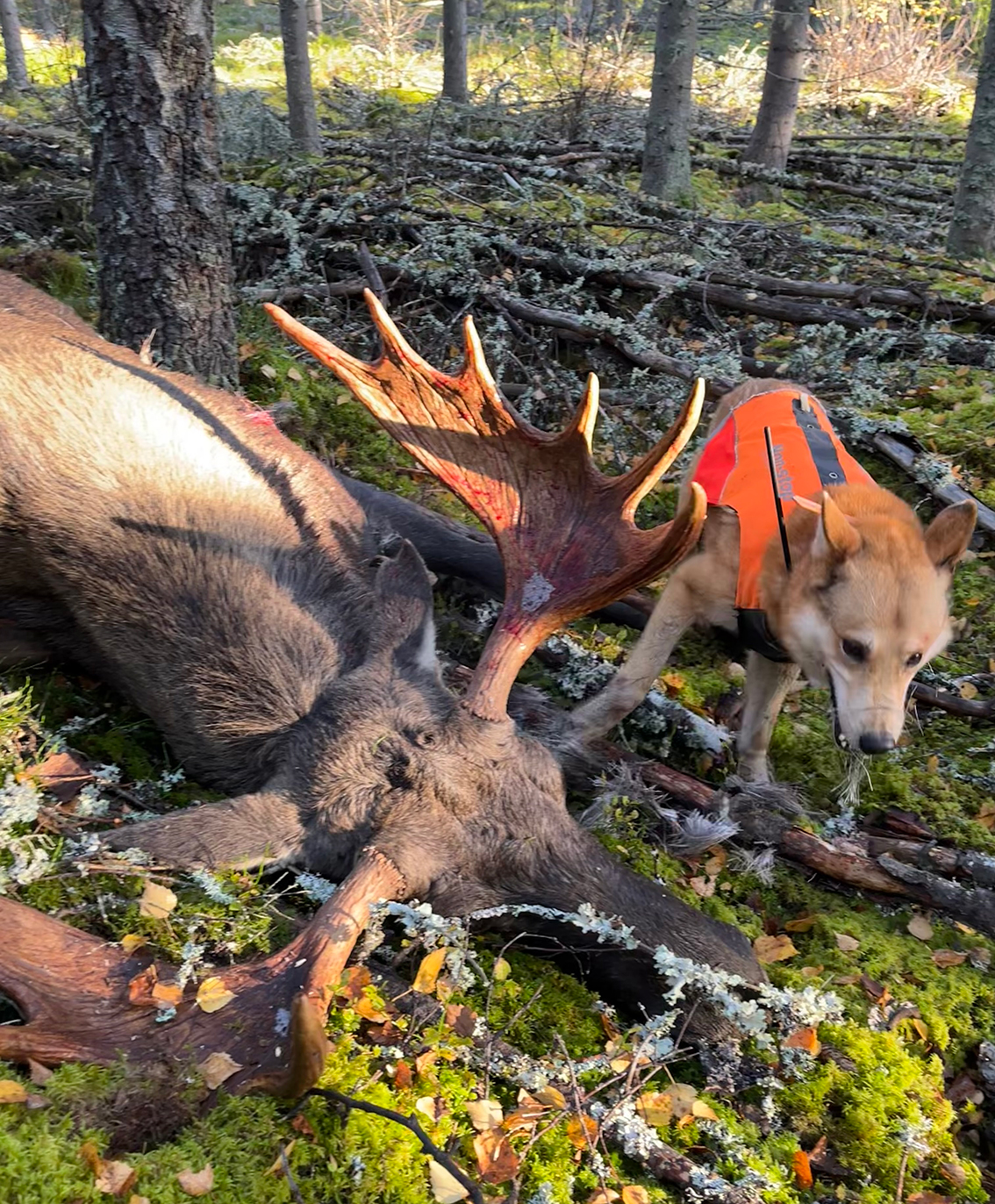 Men jakten tog inte slut där. På måndagen var det storebror Andreas tur att skriva jakthistoria. Med sin trogna älghund i spetsen lyckades han få ståndskall på en udda 14-taggare. Efter en spännande ansmygning kunde han fälla tjuren, ett bevis på både hundens skicklighet och jägarens tålamod.