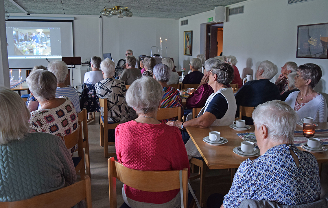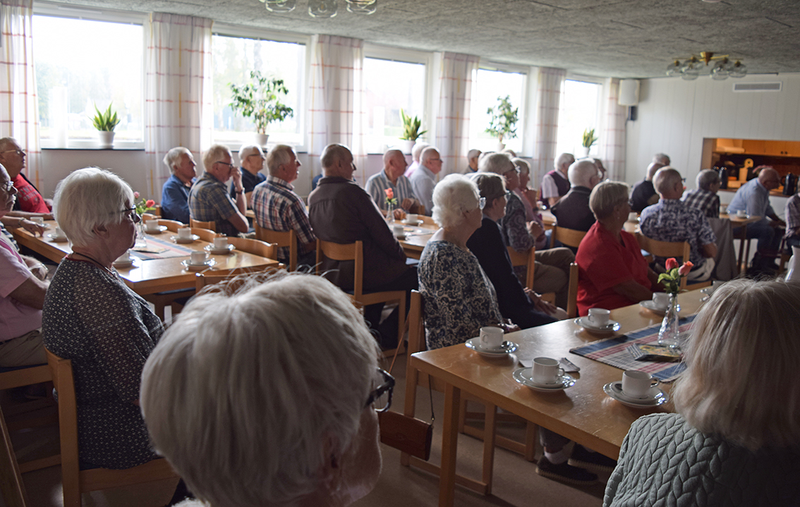 – De flesta är seniorer eftersom vi har samlingen vid den här tidpunkten på dagen. Vi har försökt att hålla tiden, 1,5 timma, då en del har annat att göra efteråt eller kanske ska passa sin färdstjäntstid. Vi är en arbetsgrupp om sju personer som jobbar med att sätta ihop program inför kommande termin. Vi har väldigt få återbud, vilket är tacksamt.