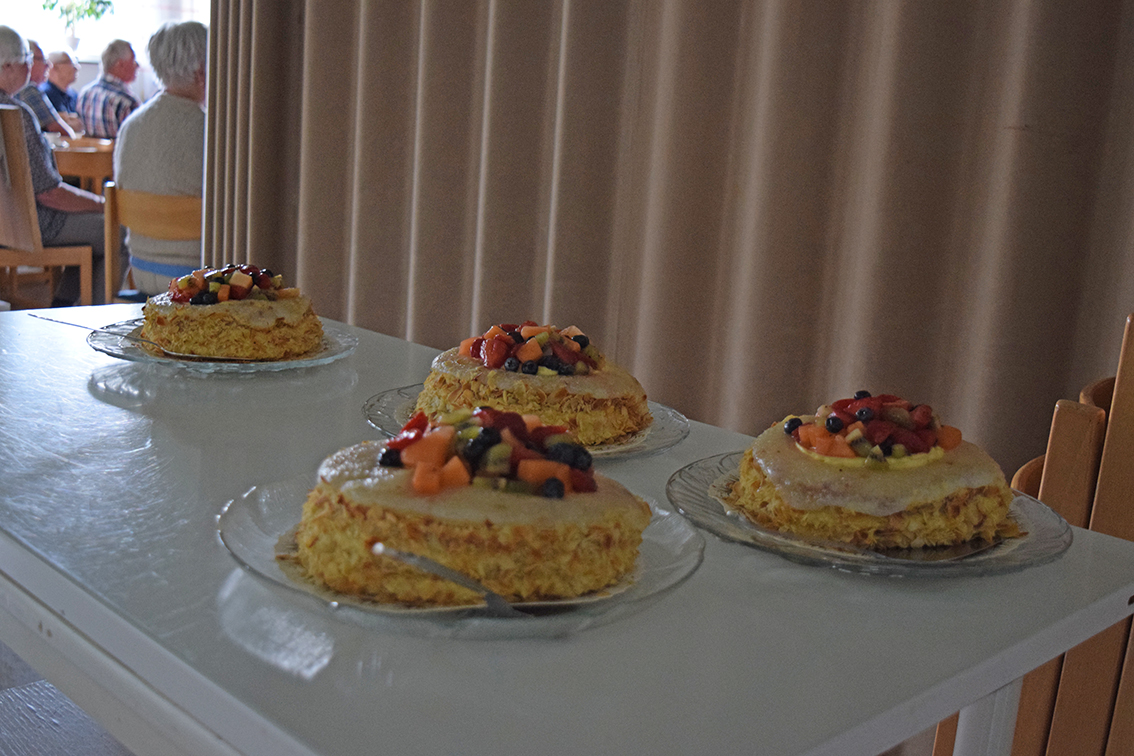 Café Gemenskap firade 20 år med tårta, bildsvep om vad som hänt under åren samt sång och musik när 74 kom till Pingstkyrkan i Klevshult.