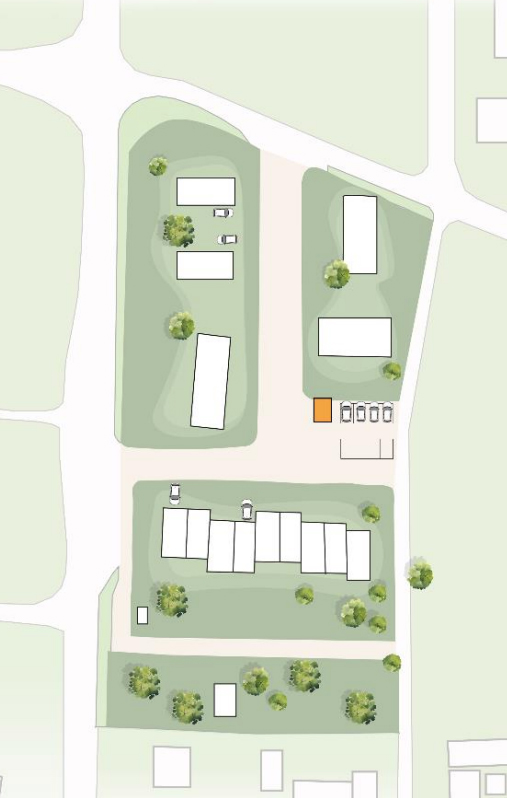 Enligt illustrationen planeras det i södra delen för radhus eller kedjehus med en maximal byggnadshöjd för huvudbyggnaden på 7,5 meter där varje bostad får egen uppfart för parkering. Utformningen kan bli nio radhus där vardera är cirka 90 kvadratmeters byggnadsarea.