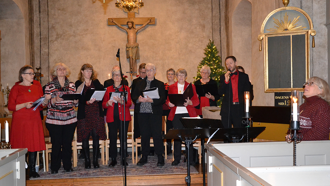 Så även i år, då i närmast en fullsatt kyrka. Hagshults kyrkokör med förstärkning och med ledning av kantor Rebecka Säll framförde flera julens vackraste sånger. Som tradition inbjuds Daniel och Stina Hjelm att sjunga solo och att ingå i körsången. Ny musiker för året var Kristina Högman som med mästerlig hand hanterade sin tvärflöjt och även dirigerade kören vid ”O helga natt”. Kyrkoherde Martin Ahlqvist förrättade andakten och för kvällen sjöng i kören.