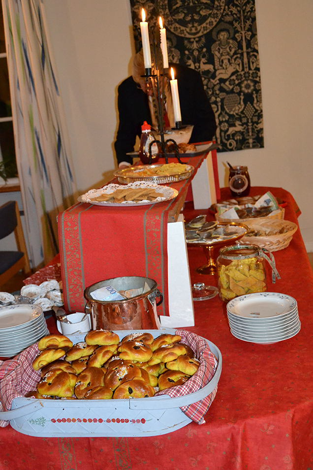 Efter denna sköna konsert så vandrade vi över till församlingshemmet. Där stod kaffeborden dukade med röda dukar, adventljusstakar som lyste stämningsfullt och i mitten av salen tronade det stora kakbordet, där flera hembakade läckerheter frestade. Nytt för i år, var att en ostkaka minsann hade smugit sig in.