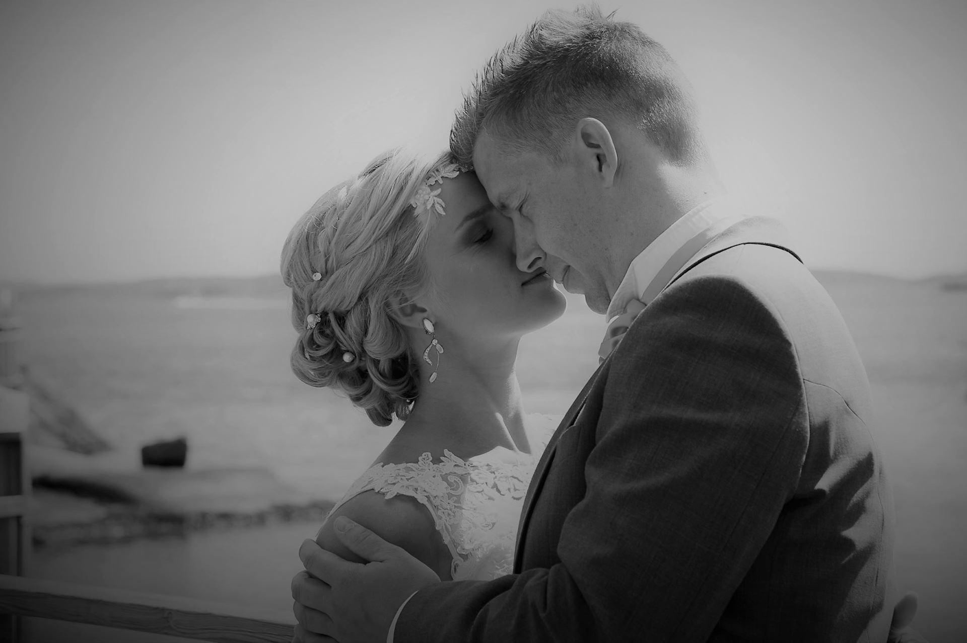 Ett nygift par står på en brygga vid havet. En fin närbild som ändå inte är för påträngande. Det är bara paret som är i fokus. Bilden visar tydligt hur de njuter av varandra. Behagligt ljus och fin gråskala. Bra!