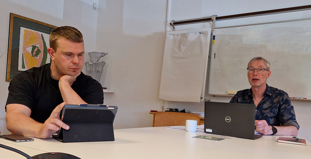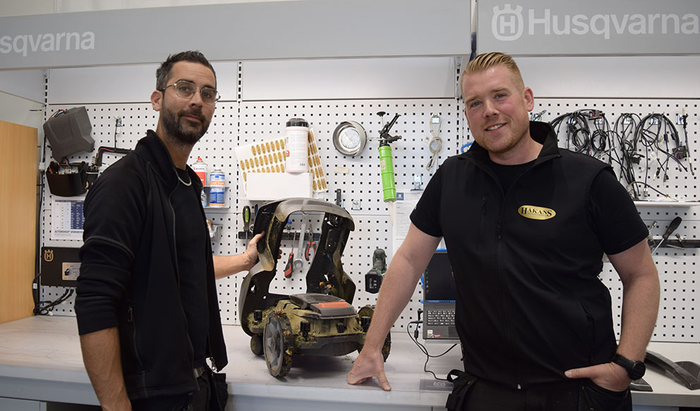 Underhållsladdning, hur gör jag det? – Det går till så att man sätter roboten i laddstationen, slår på strömmen, laddar fullt och sedan stänger man av roboten. Om jag inte gör det är risken att batteriet går ner i ”djup sömn”. Gör den det så får man inte igång den själv. Då får man lämna in och ”väcka” upp robotgräsklipparen. Man bör underhållsladda två gånger under vintervilan, berättar Jimmy och Dennis.
