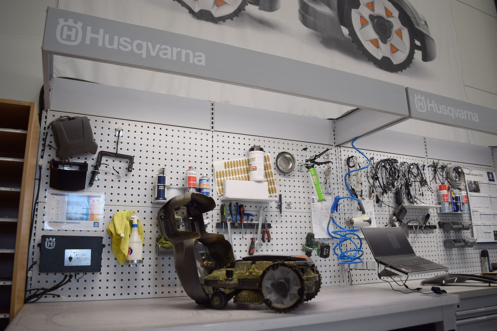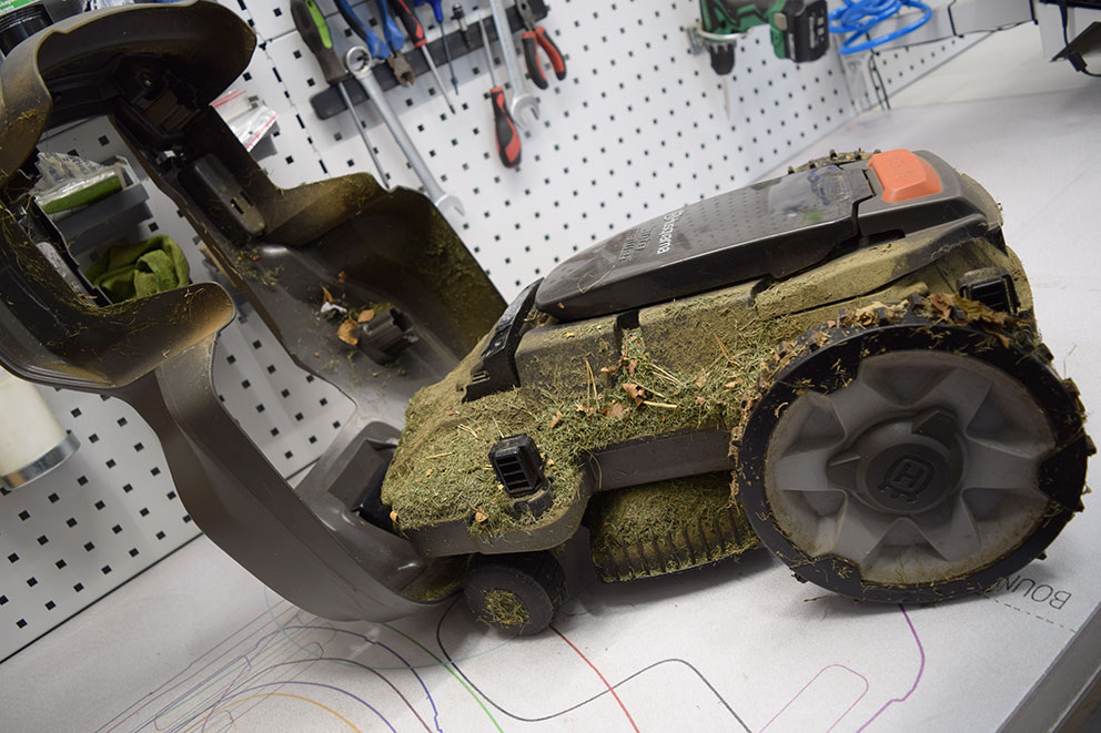 – Ska man göra det själv är det viktigt att använda borste och tryckluft, inte spola med vatten för risken är att det tränger in fukt på fel ställe. Viktigt att man lämnar in den en gång på service om året, det sitter tätningslister i roboten och dessa får sämre förmåga att täta med tiden. Vi byter ut tätningslisterna och uppdaterar mjukvaran i roboten. I och med servicen får man längre livslängd på roboten. Man kan komma hit med sin robot och lämna in den på service och sedan sköta vinterförvarningen själv. Eller så kan den få bo på vårt robothotell med ett par andra hundra likasinnade. Eller så kan man boka att vi sköter den, hämtar, förvara, serva och ställer tillbaka roboten i din trädgård när det är dags.