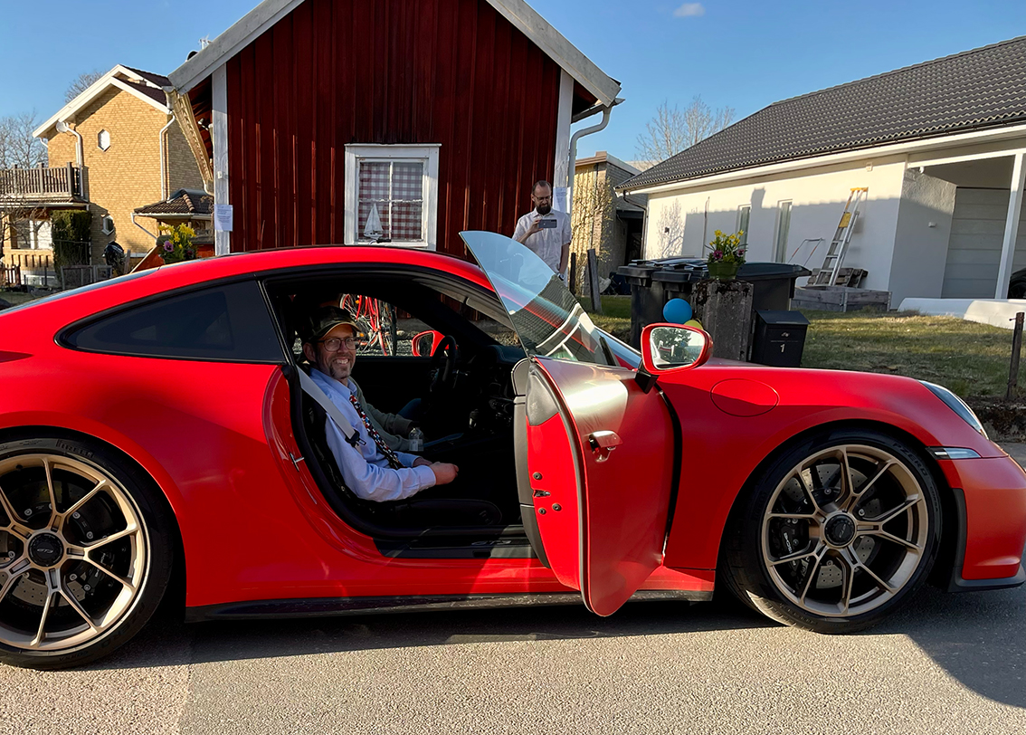 När tidningen var på besök ringde Daniels telefon och han blev ombedd att gå ut till vägen där en cool Porsche kom och hämtade upp honom för en runda.
