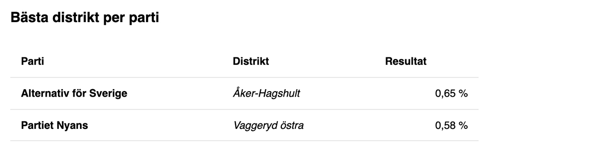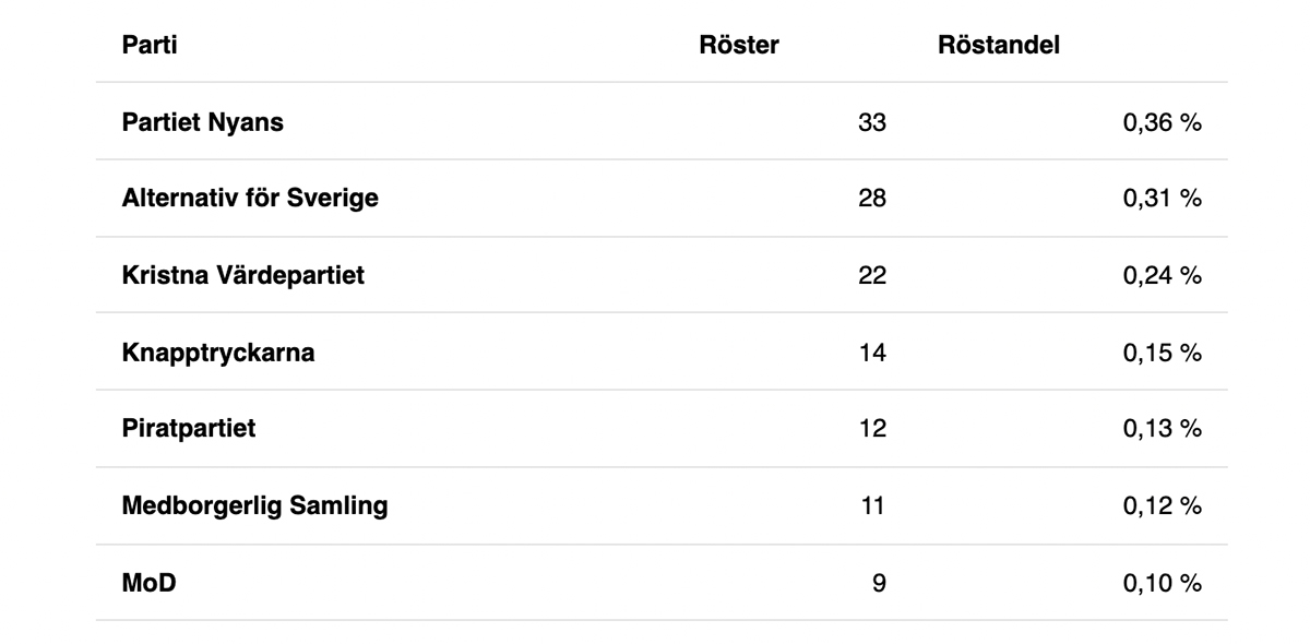 Två partier fick en halv procent eller mer av rösterna i något distrikt: Alternativ för Sverige och Partiet Nyans.