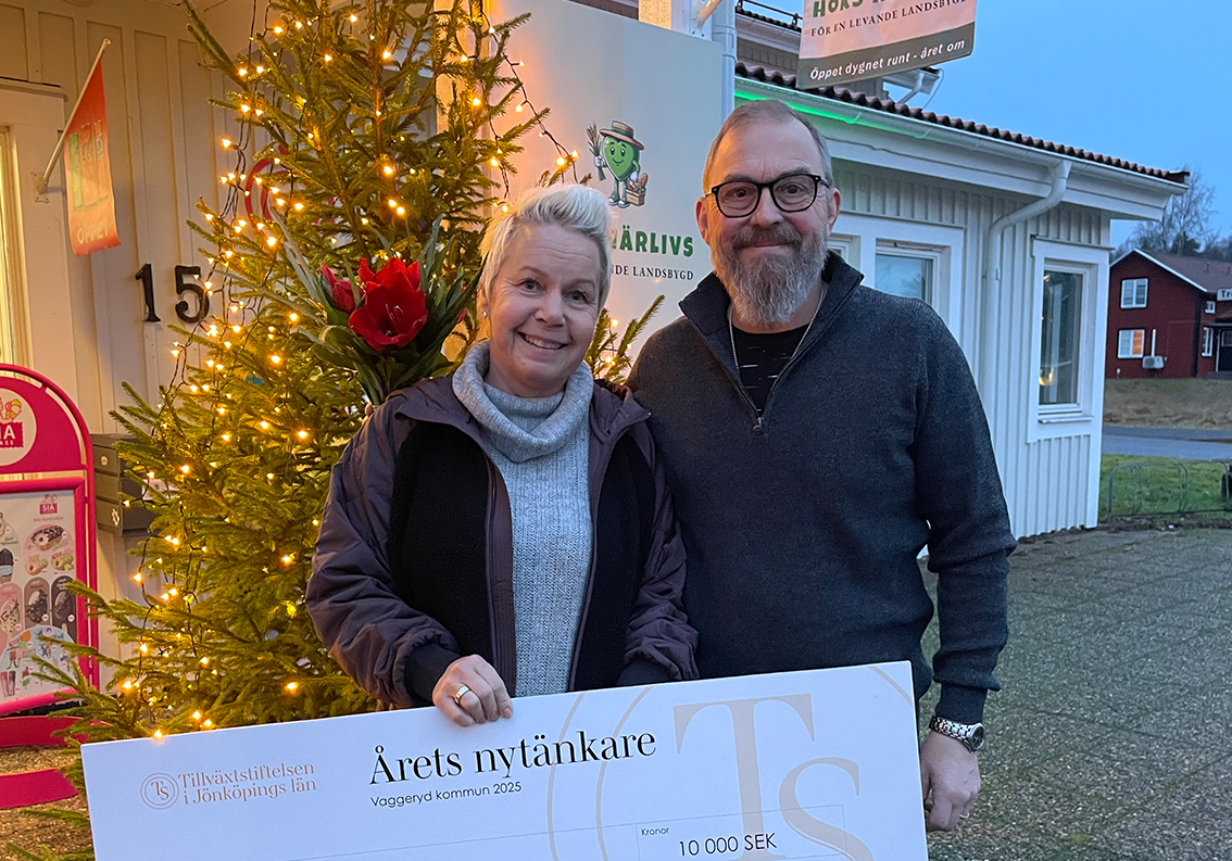 Nu får de alltså pris för sin satsning med butiken. Det är Tillväxtstiftelsen i Jönköpings län, tillsammans med Science Park och länets kommuner som har instiftat priset Årets nytänkare. Varje kommun i länet delar ut priset och det syftar till att lyfta fram entreprenörskap och goda förebilder som kan inspirera andra att tänka stort, tänka nytt. Det var flera nominerade i Vaggeryds kommun, men beslutet landade på att Helena och Per från Hoks Närlivs skulle bli vinnaren i år. Av flera anledningar.